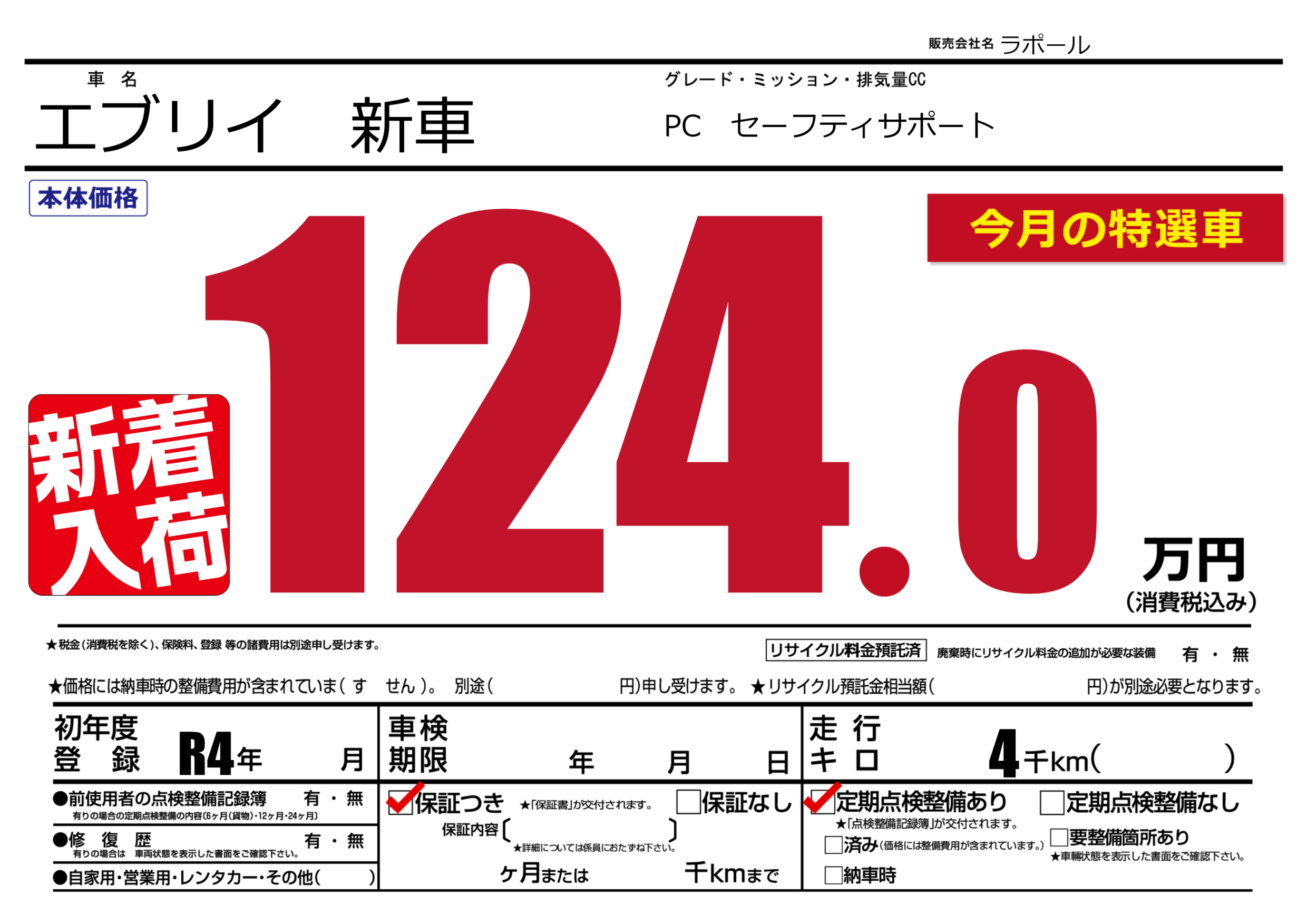 | 車名 | エブリイ 新車 | グレード ミッション 排気量 |