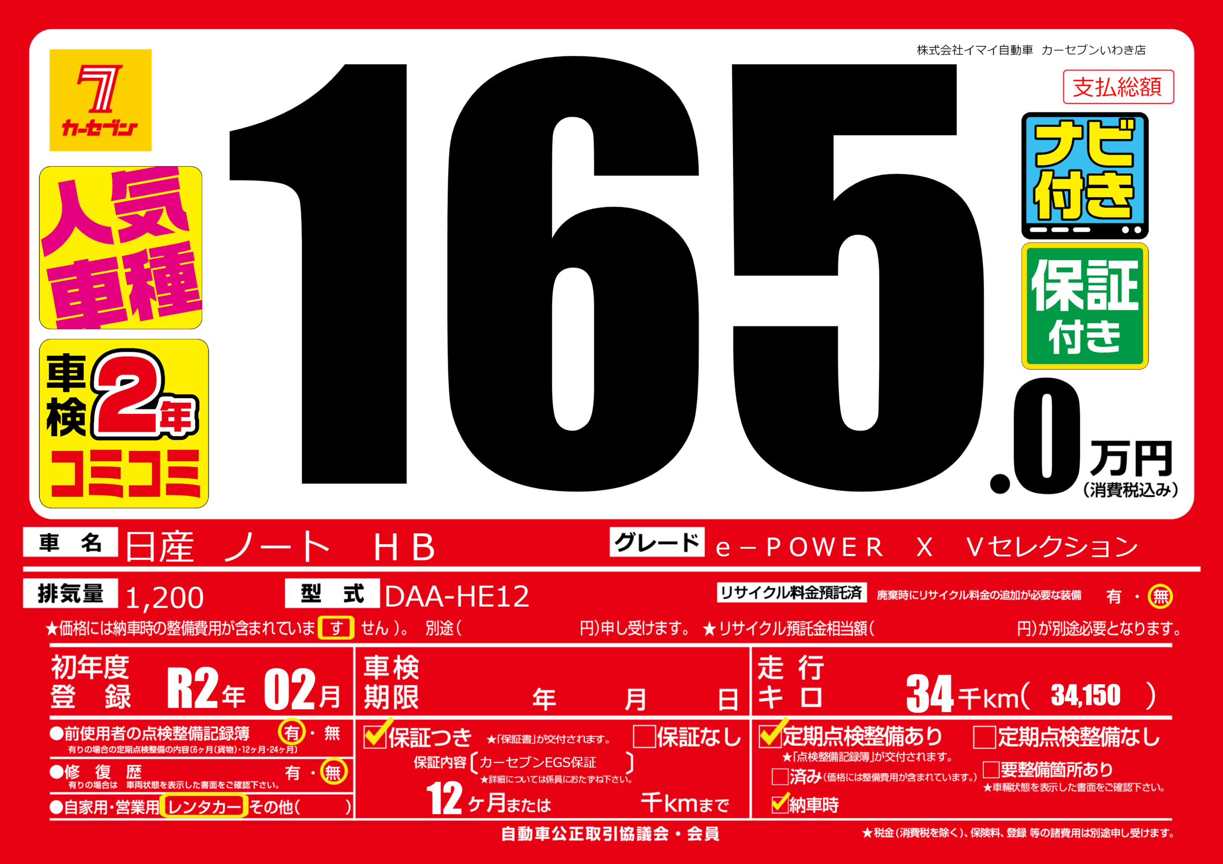 保証付き 保証内容(カーセブンEGS保証) 12ヶ月または千km |