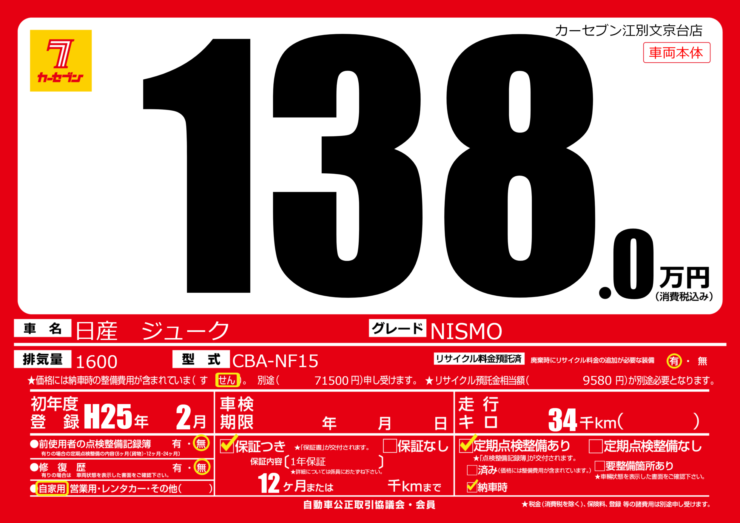 | 車名 | 日産 ジューク | グレード ミッション 排気量 |