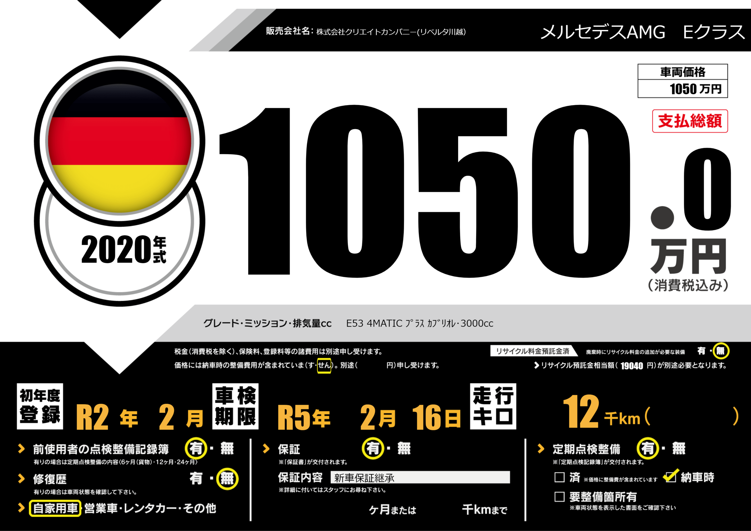 | 車名 | メルセデスAMG Eクラス | グレード ミッション 排気量 |