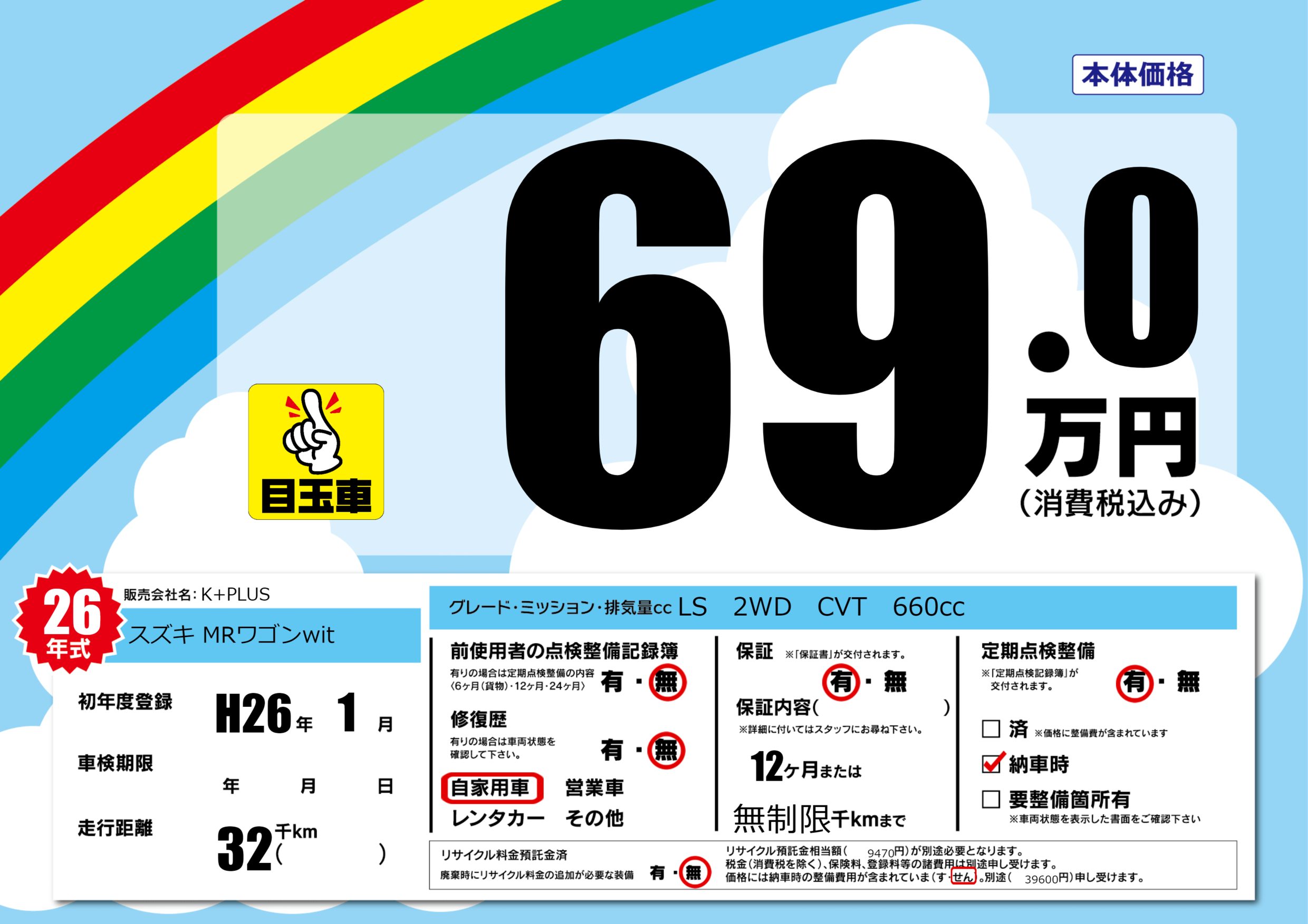 | 車名 | スズキ MRワゴンwit | グレード ミッション 排気量 |