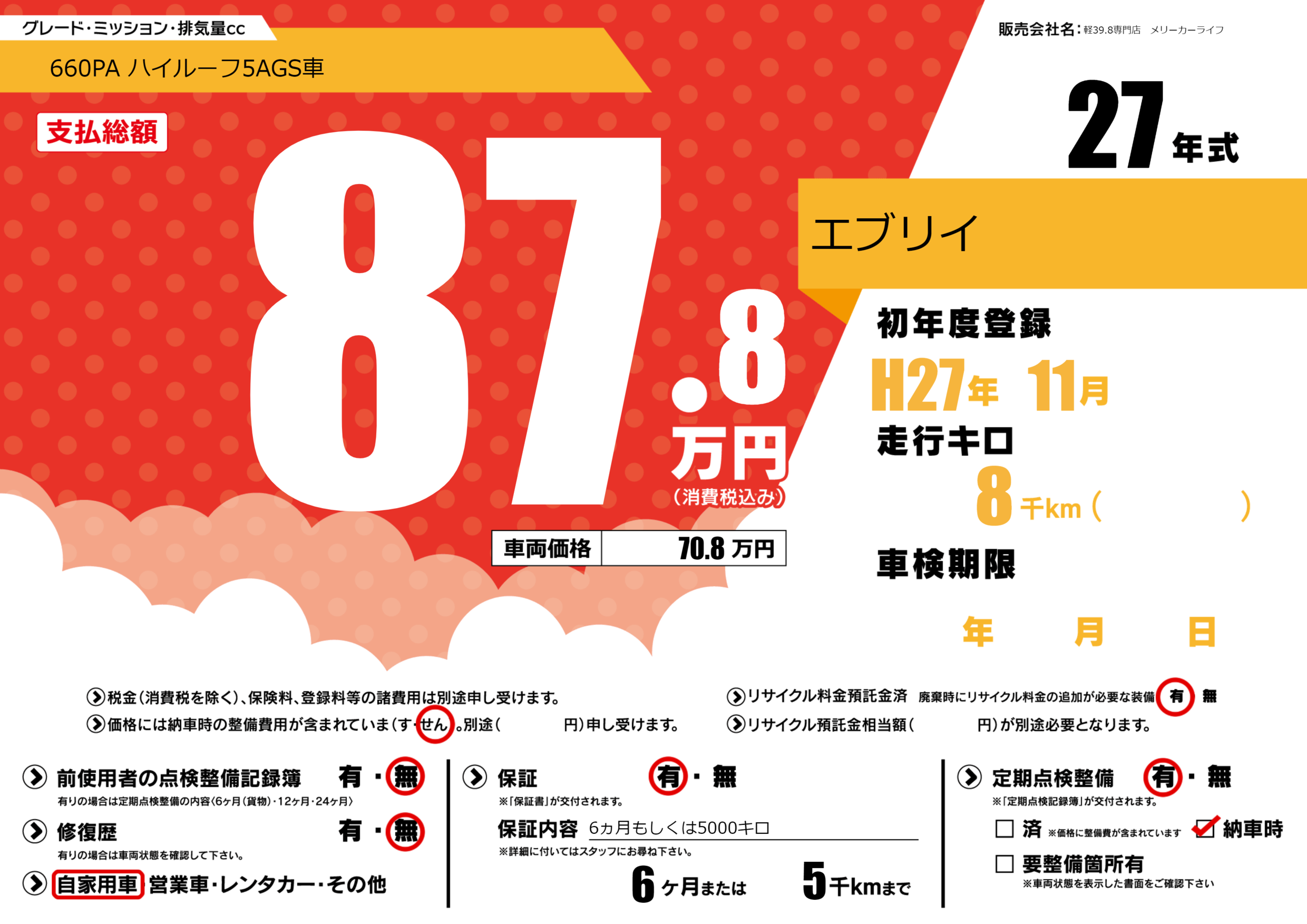 | 定期点検整備 | 定期点検整備あり 納車時あり | ||