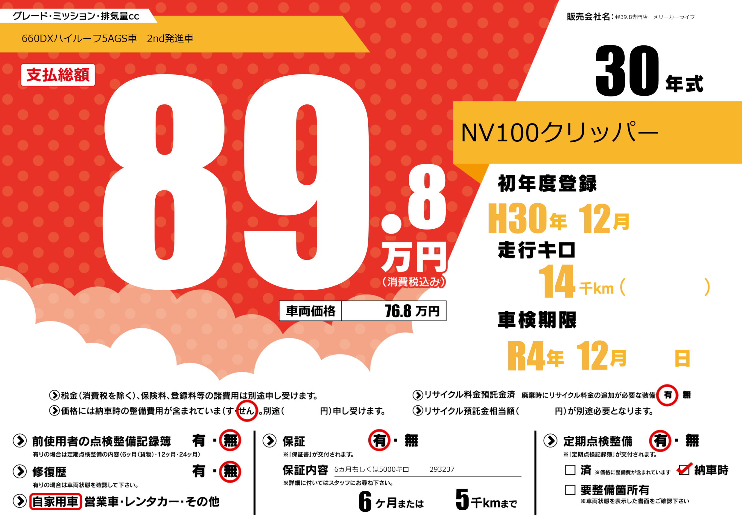 | 定期点検整備 | 定期点検整備あり 納車時あり | ||