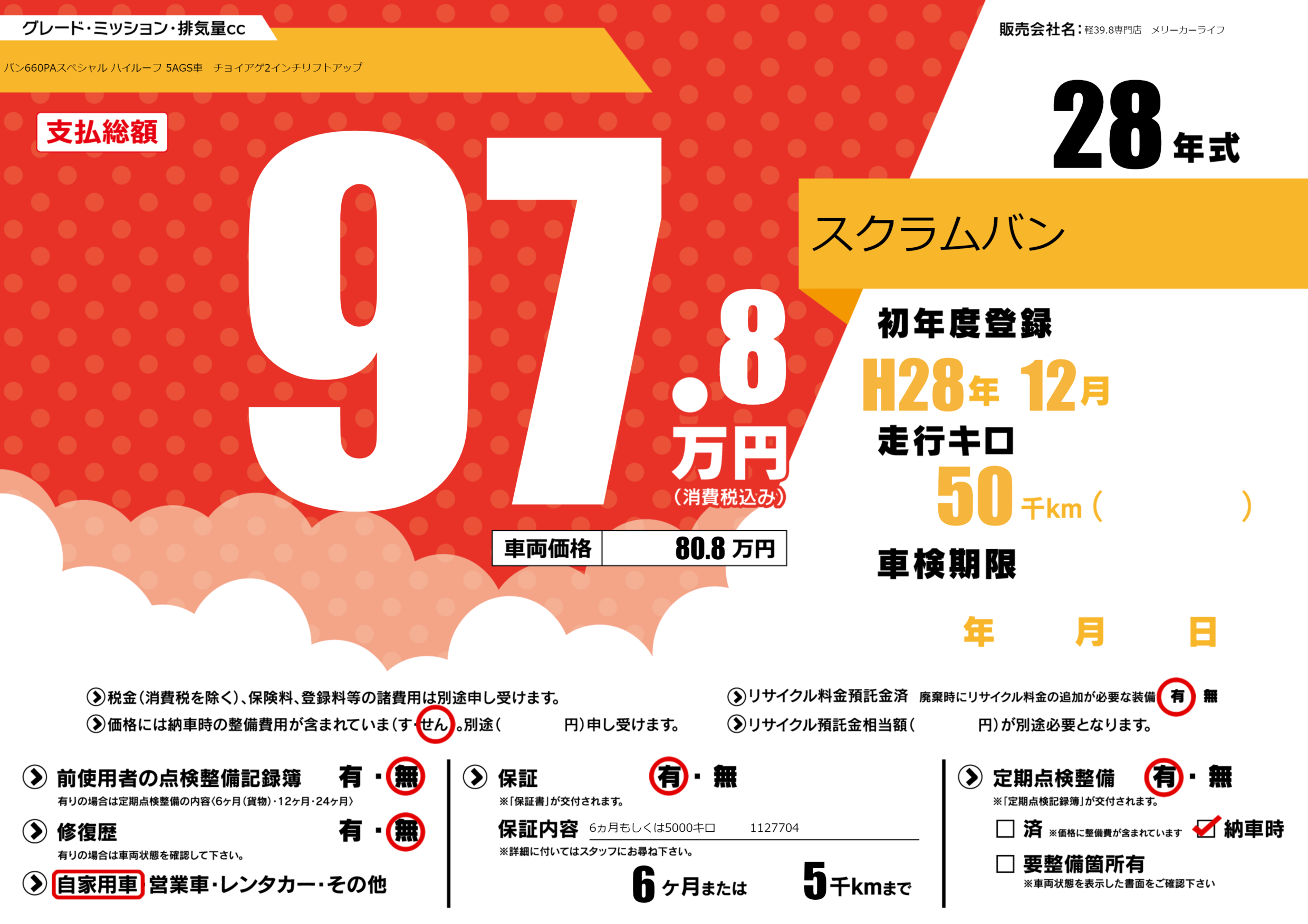 | 定期点検整備 | 定期点検整備あり 納車時あり | ||