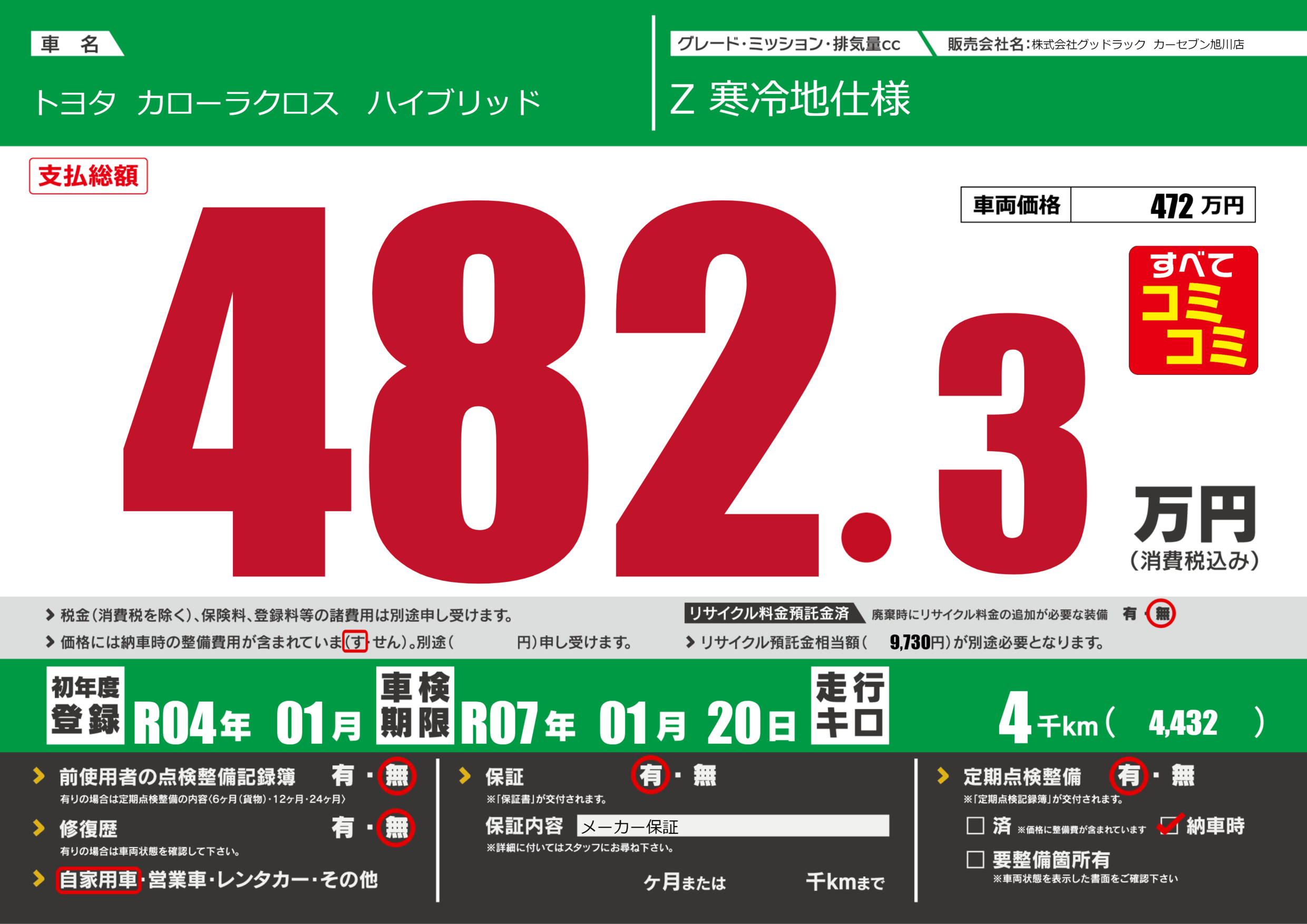| 車名 | トヨタ カローラクロス ハイブリッド | グレード ミッション 排気量 |