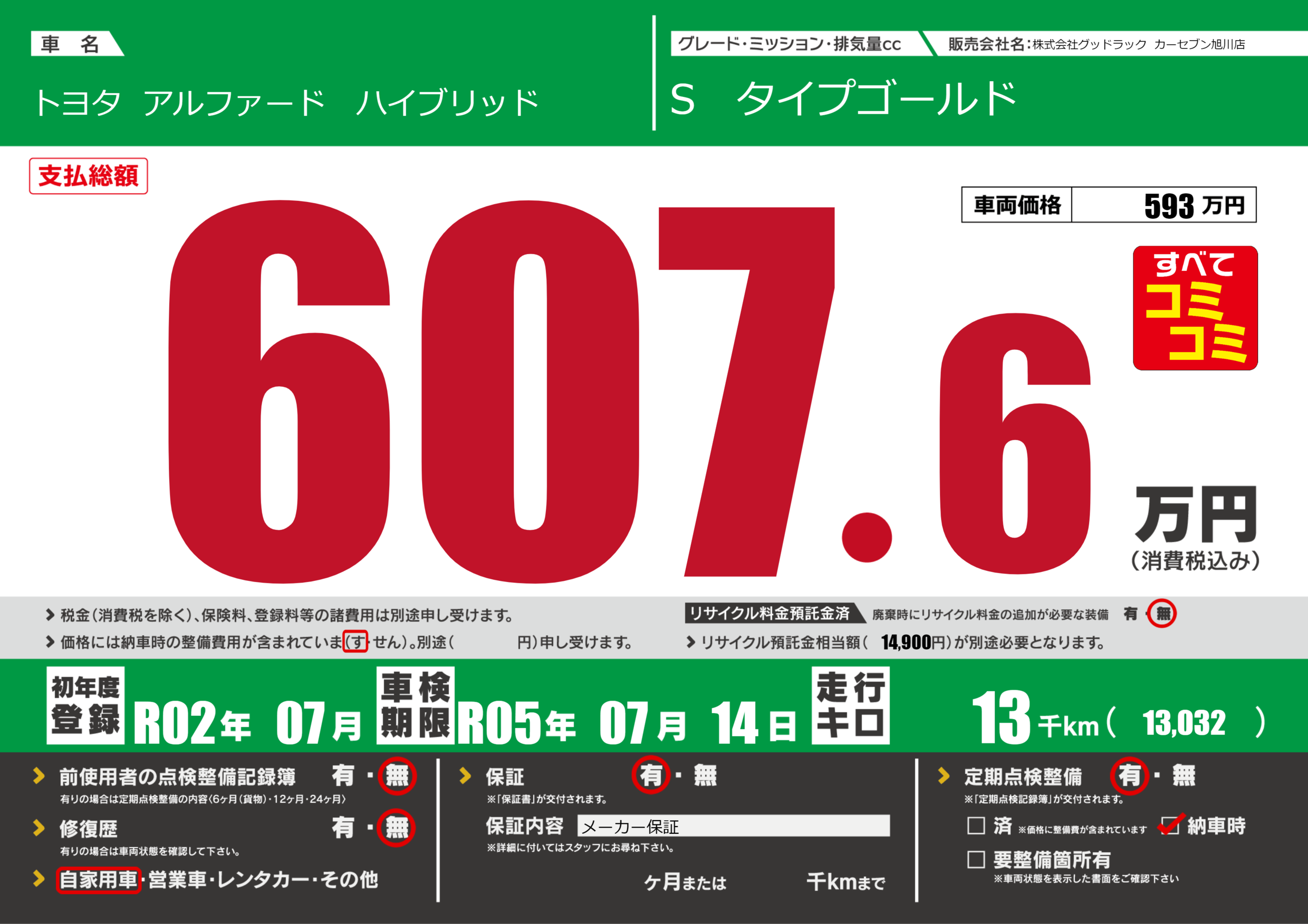 | 走行キロ | 1.3万km | 初年度登録 | R02年07月 |