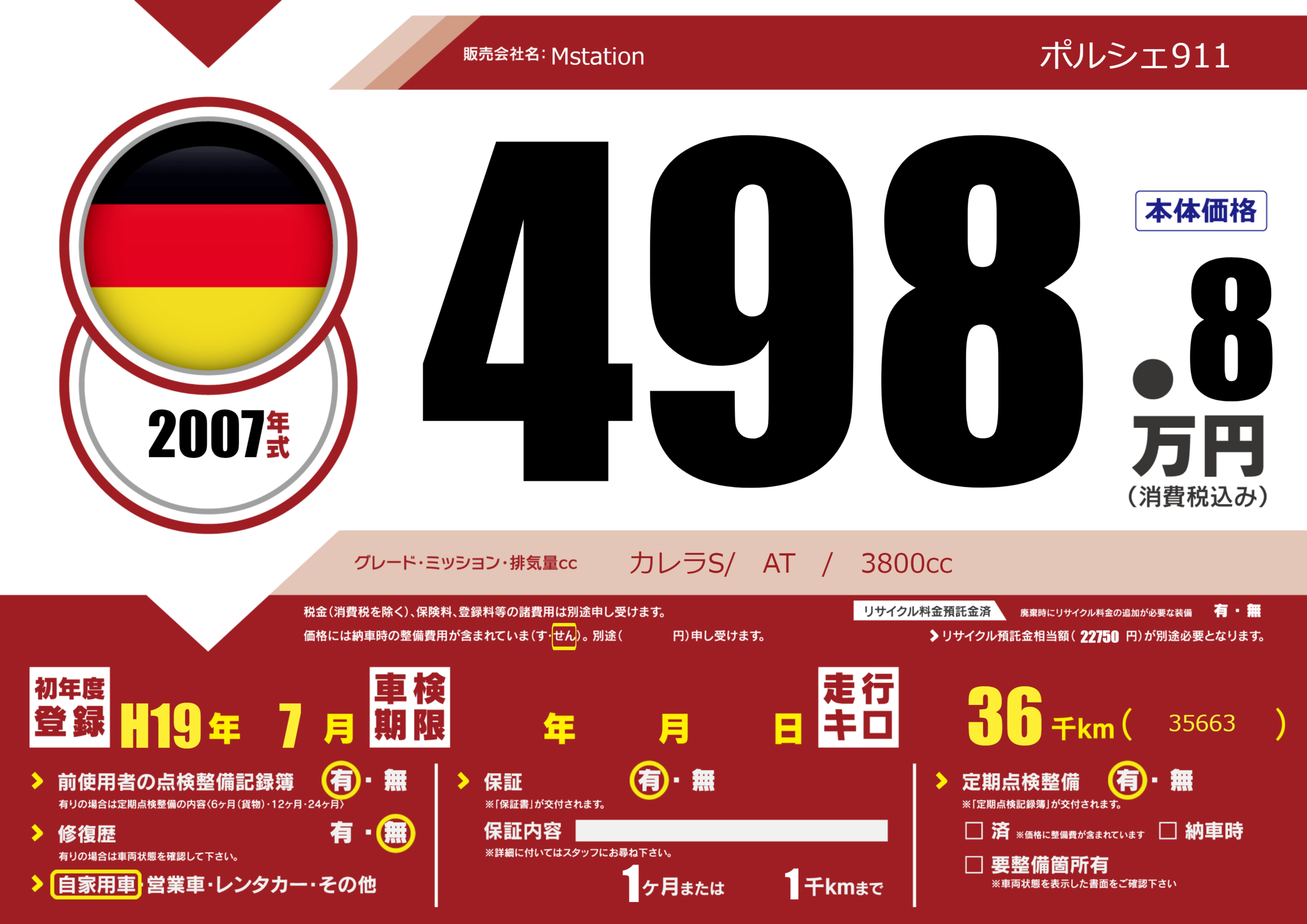 | 車名 | ポルシェ911 | グレード ミッション 排気量 |