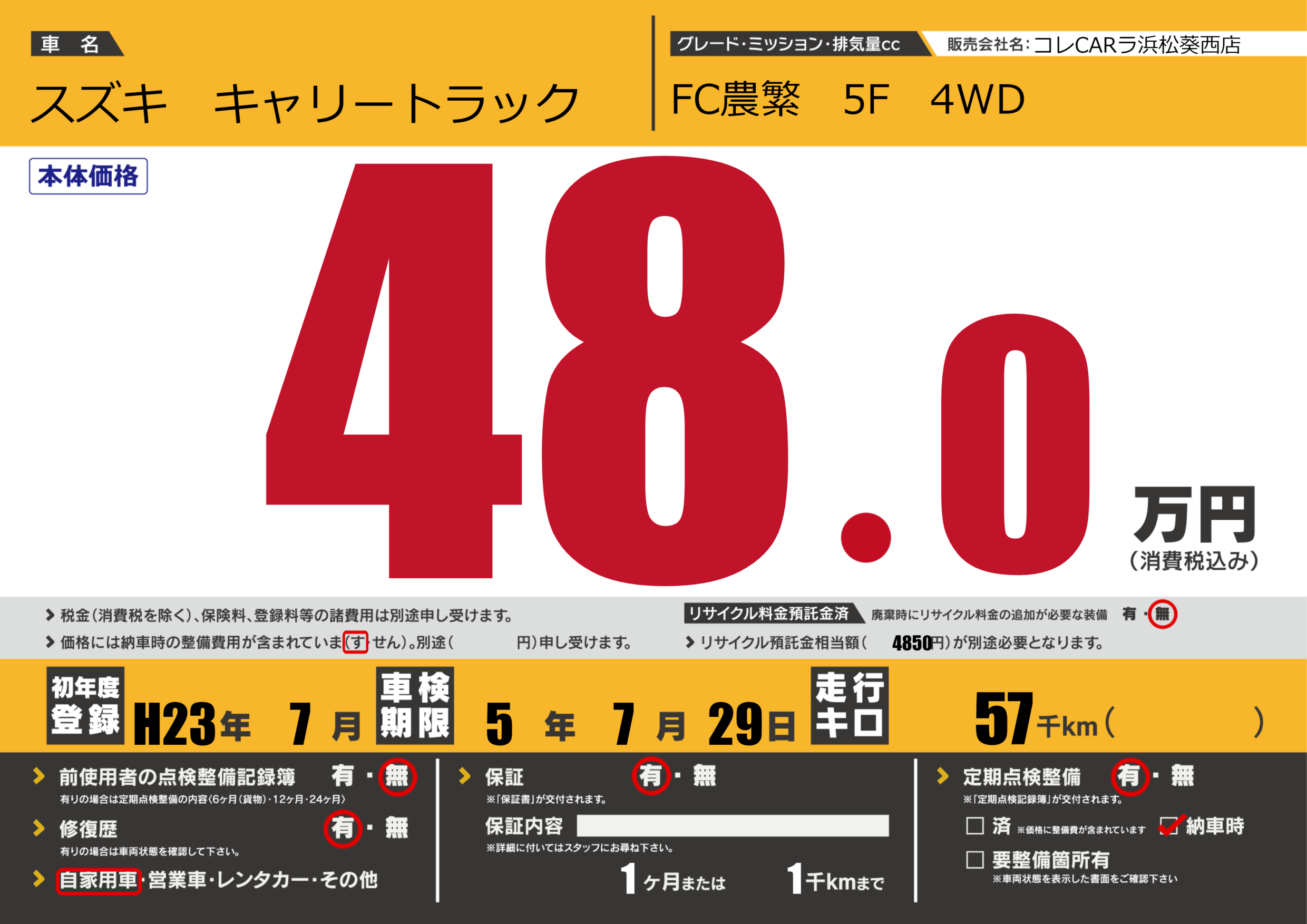 | 走行キロ | 5.7万km | 初年度登録 | H23年7月 |