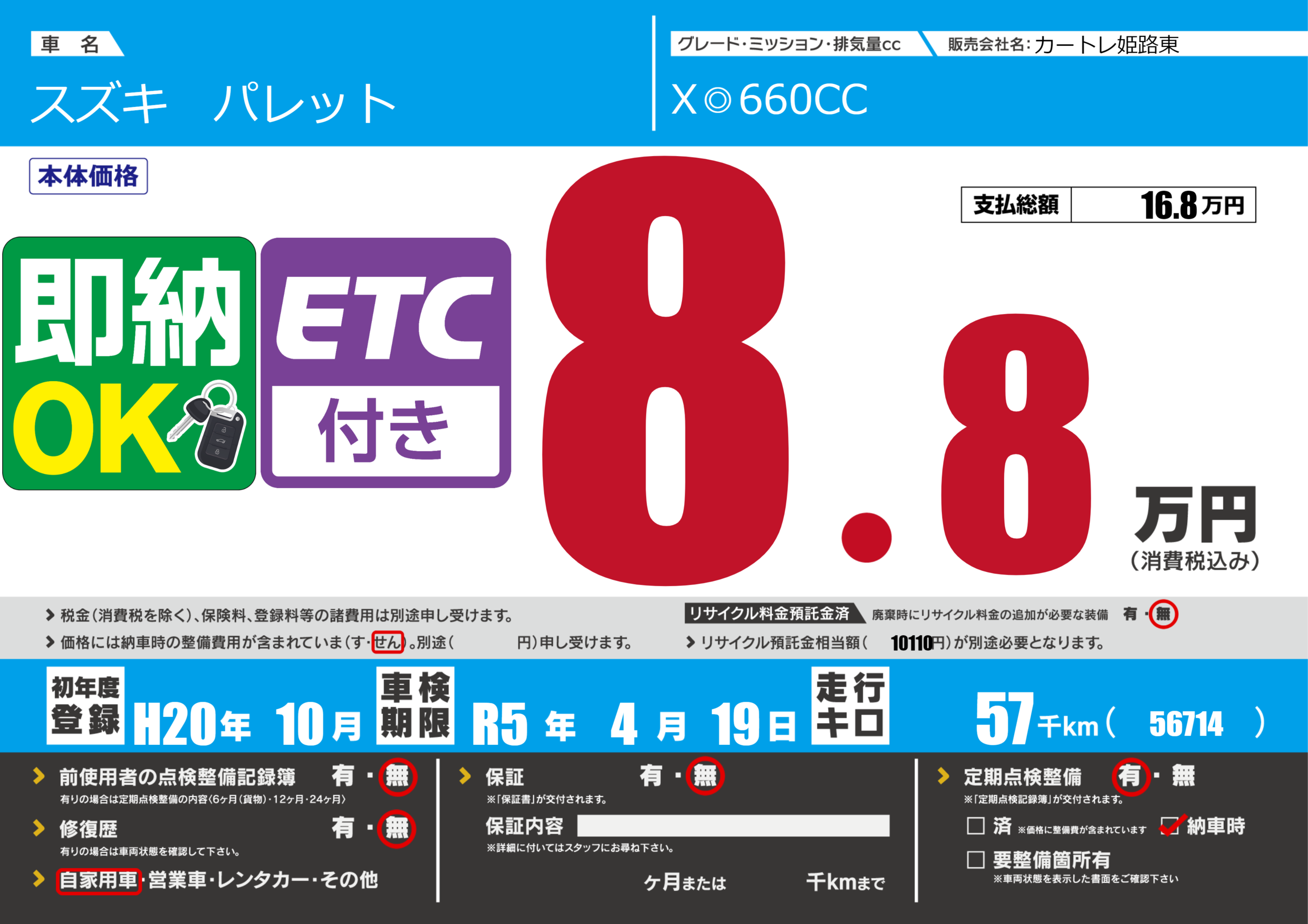 | 車名 | スズキ パレット | グレード ミッション 排気量 |