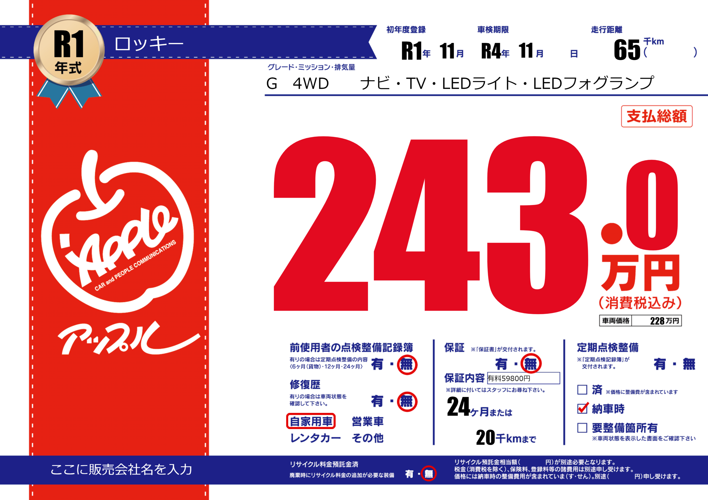 保証なし 保証内容(有料59800円) 24ヶ月または(20)千kmまで |