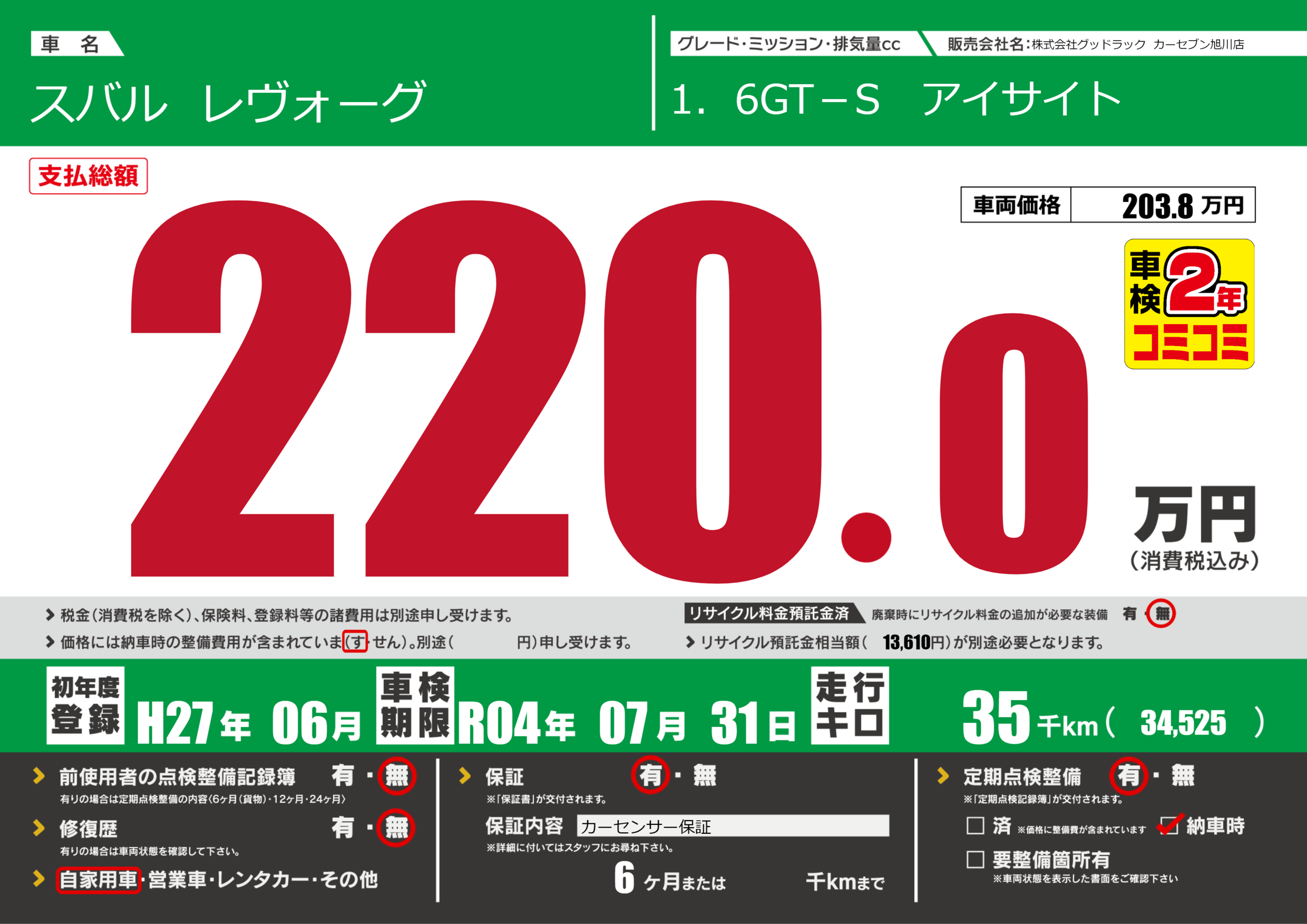 | 車名 | スバル レヴォーグ | グレード ミッション 排気量 |