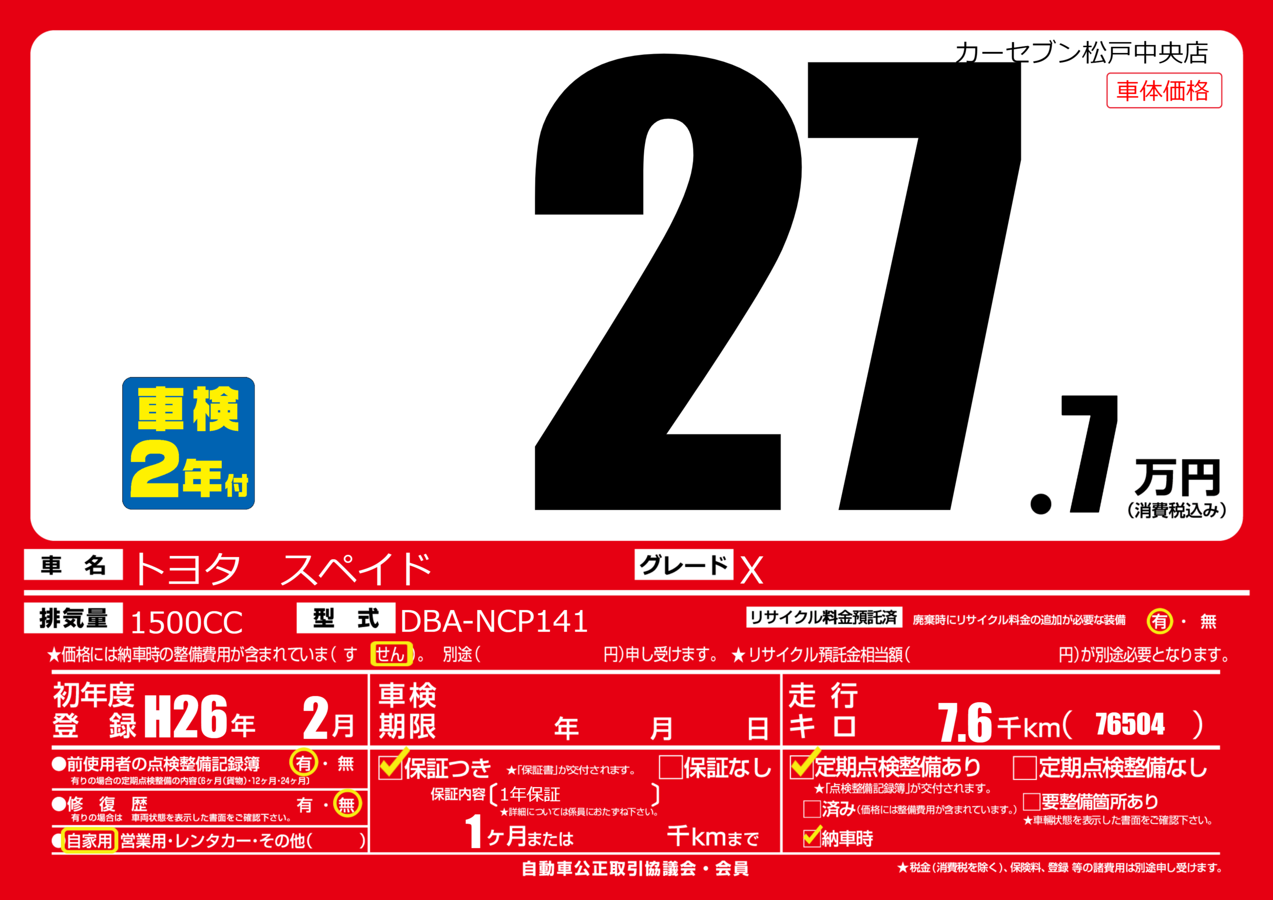 | 車名 | トヨタ スペイド | グレード ミッション 排気量 |
