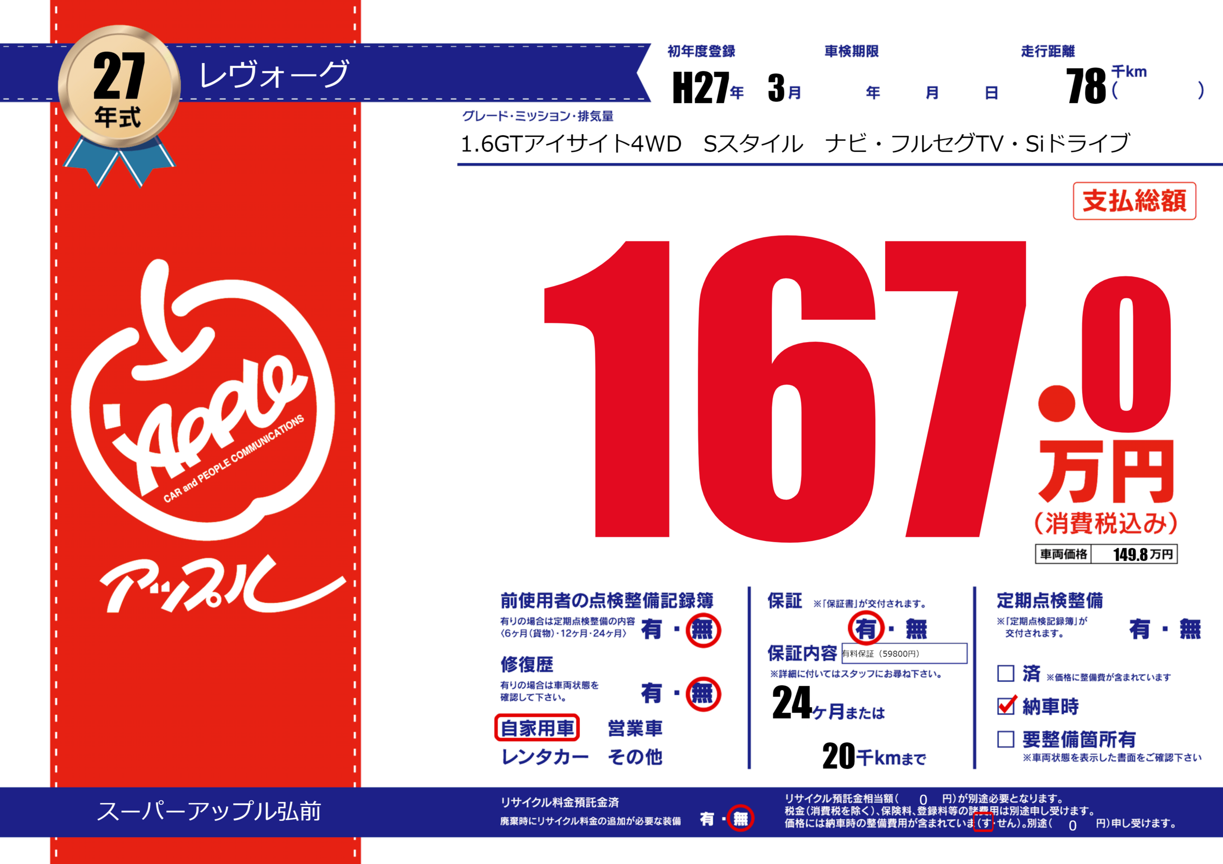 1.6GTアイサイト4WD Sスタイル ナビ・フルセグTV・Siドライブ |