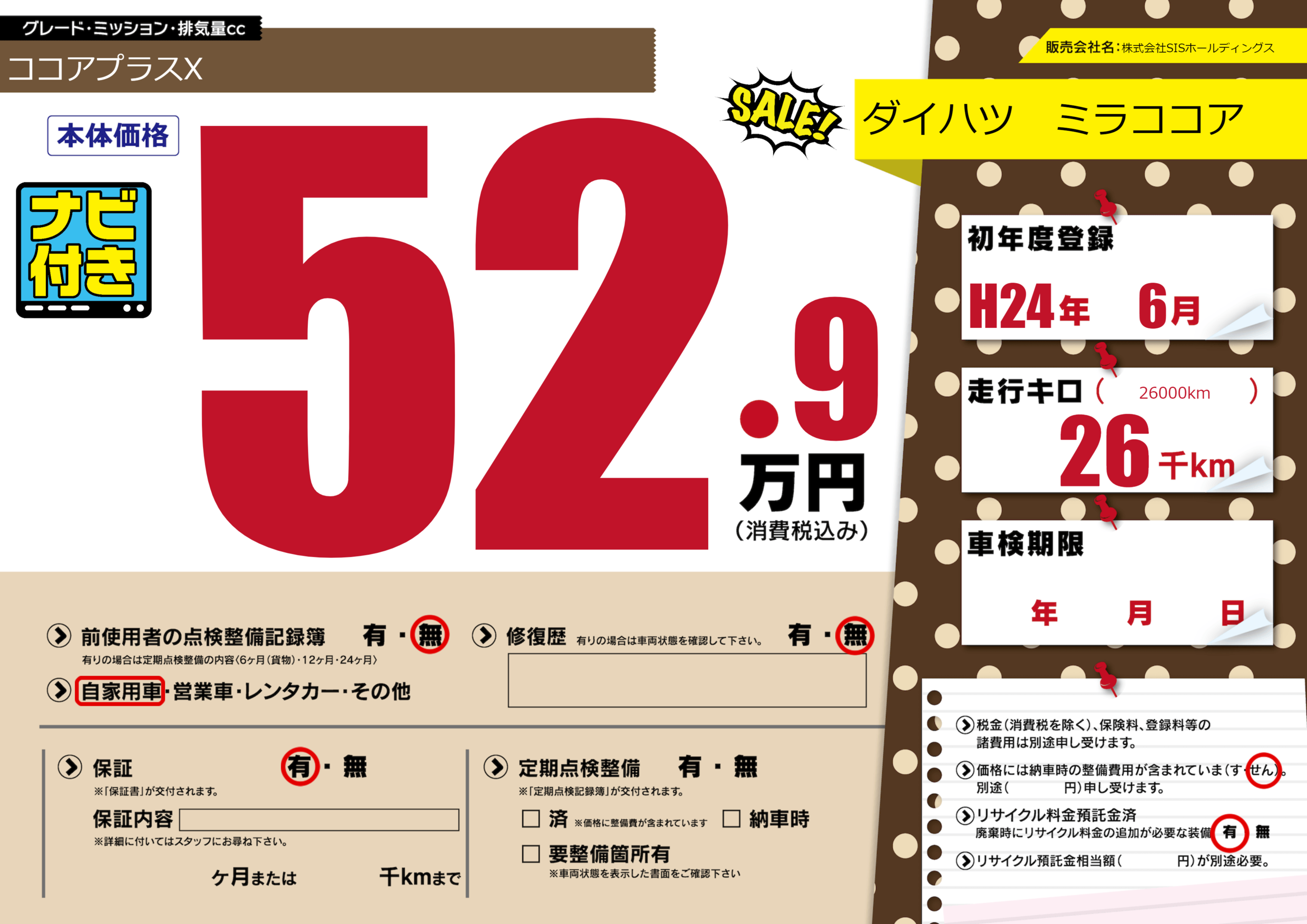 | 車名 | ダイハツ ミラココア | グレード ミッション 排気量 |