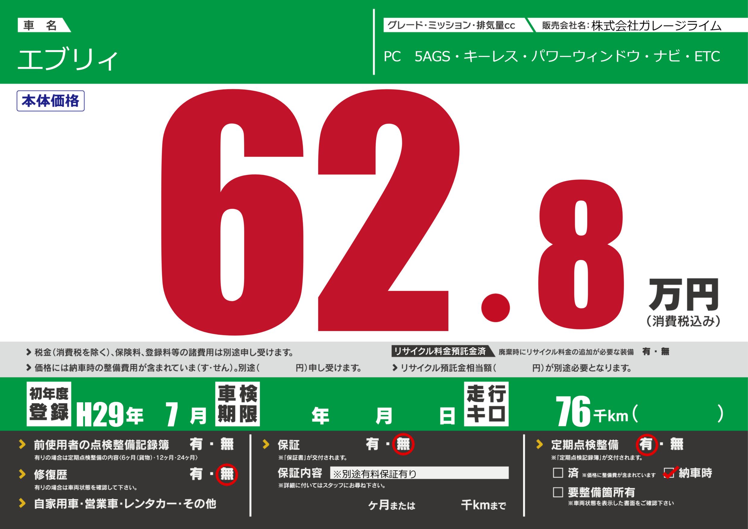 保証なし 保証内容(※別途有料保証有り) ---ヶ月または()千kmまで |