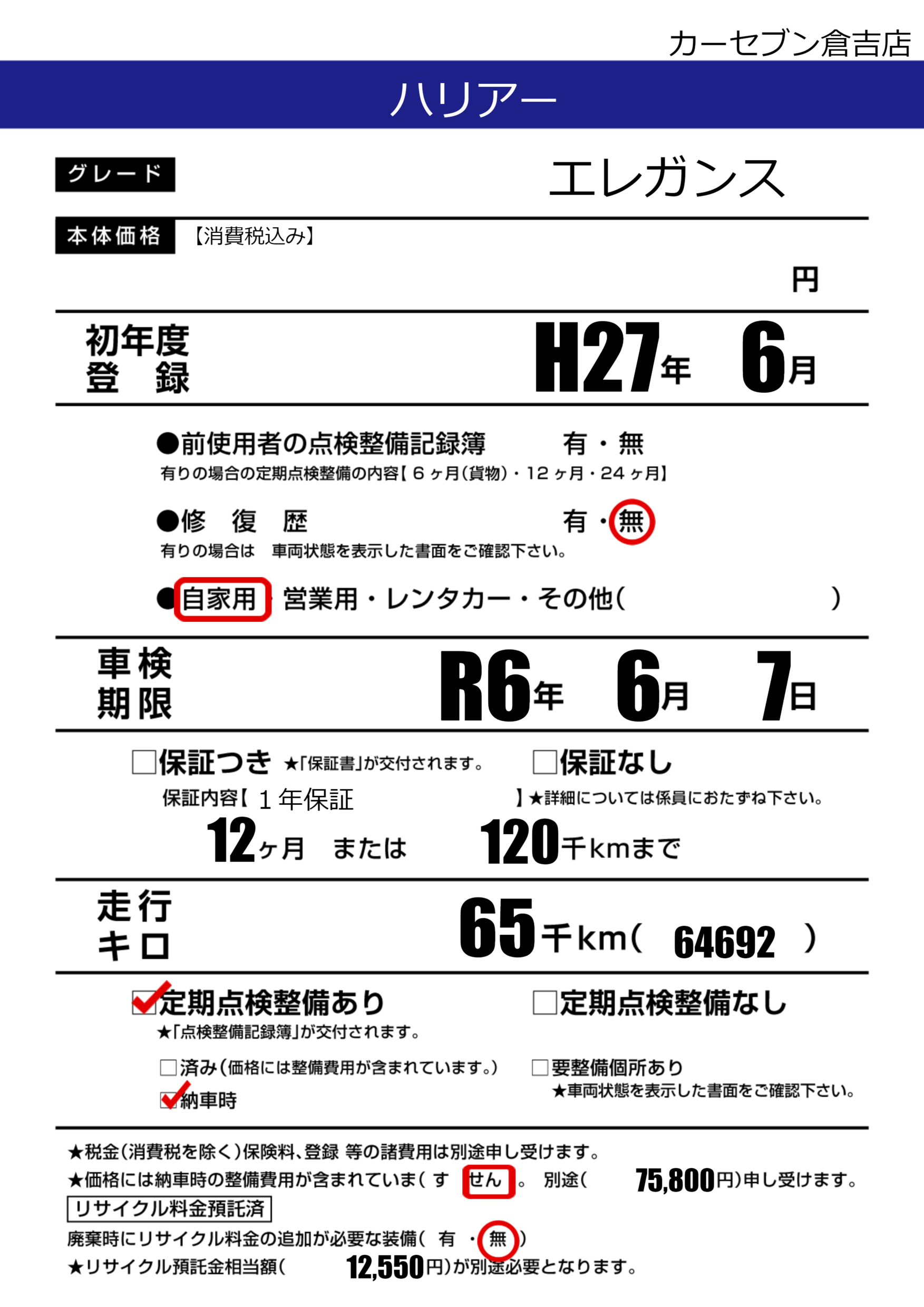 | 走行キロ | 6.5万km | 初年度登録 | H27年6月 |