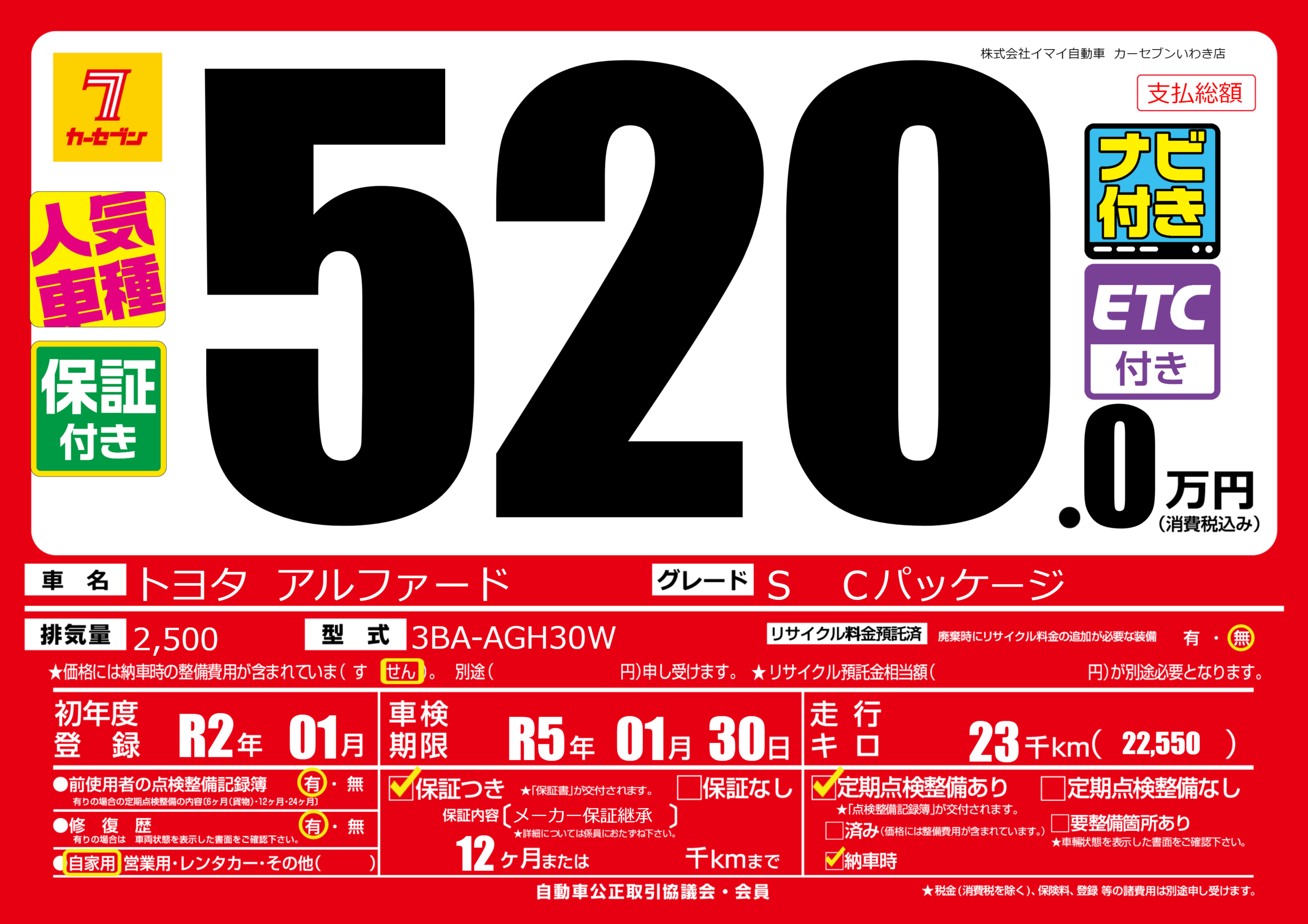 | 車名 | トヨタ アルファード | グレード ミッション 排気量 |