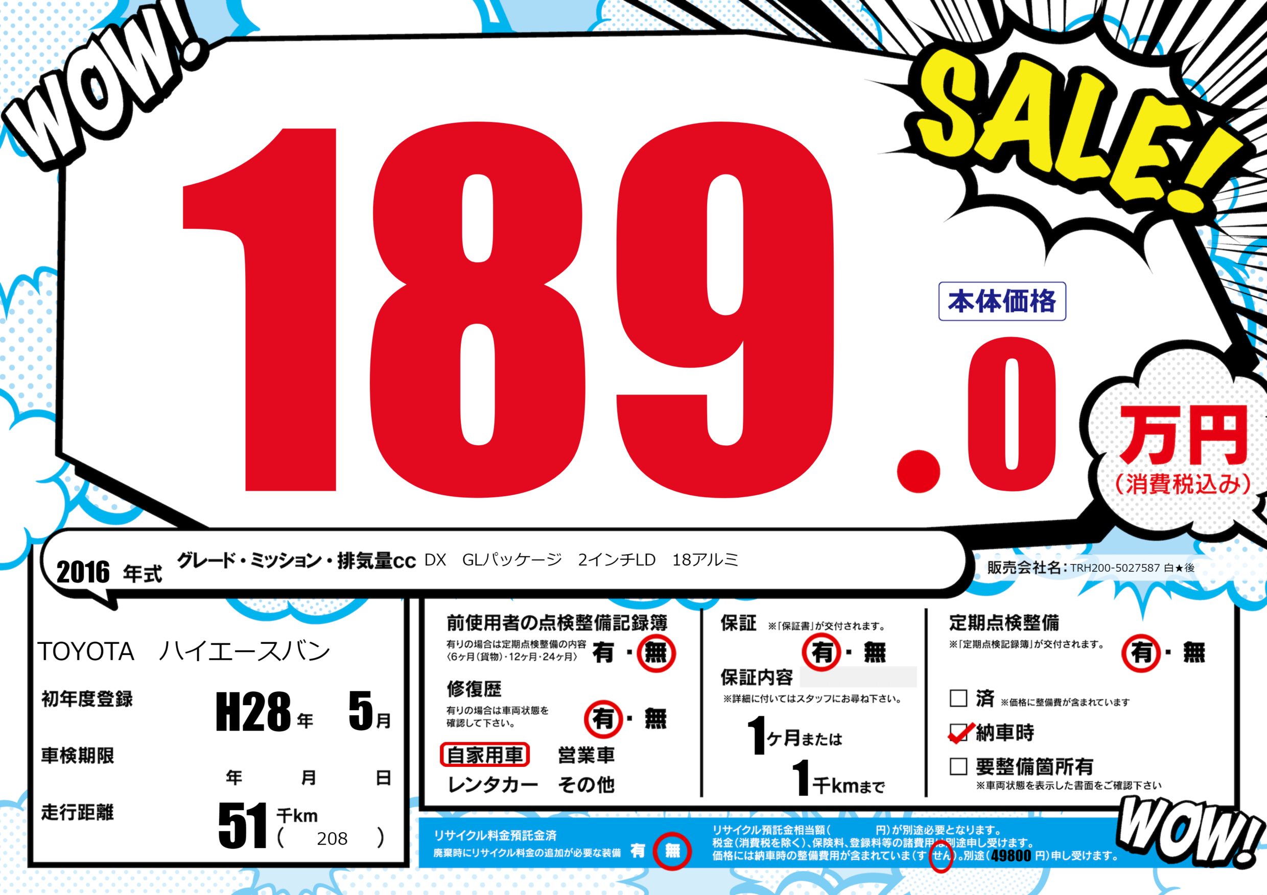 | 車名 | TOYOTA ハイエースバン | グレード ミッション 排気量 |