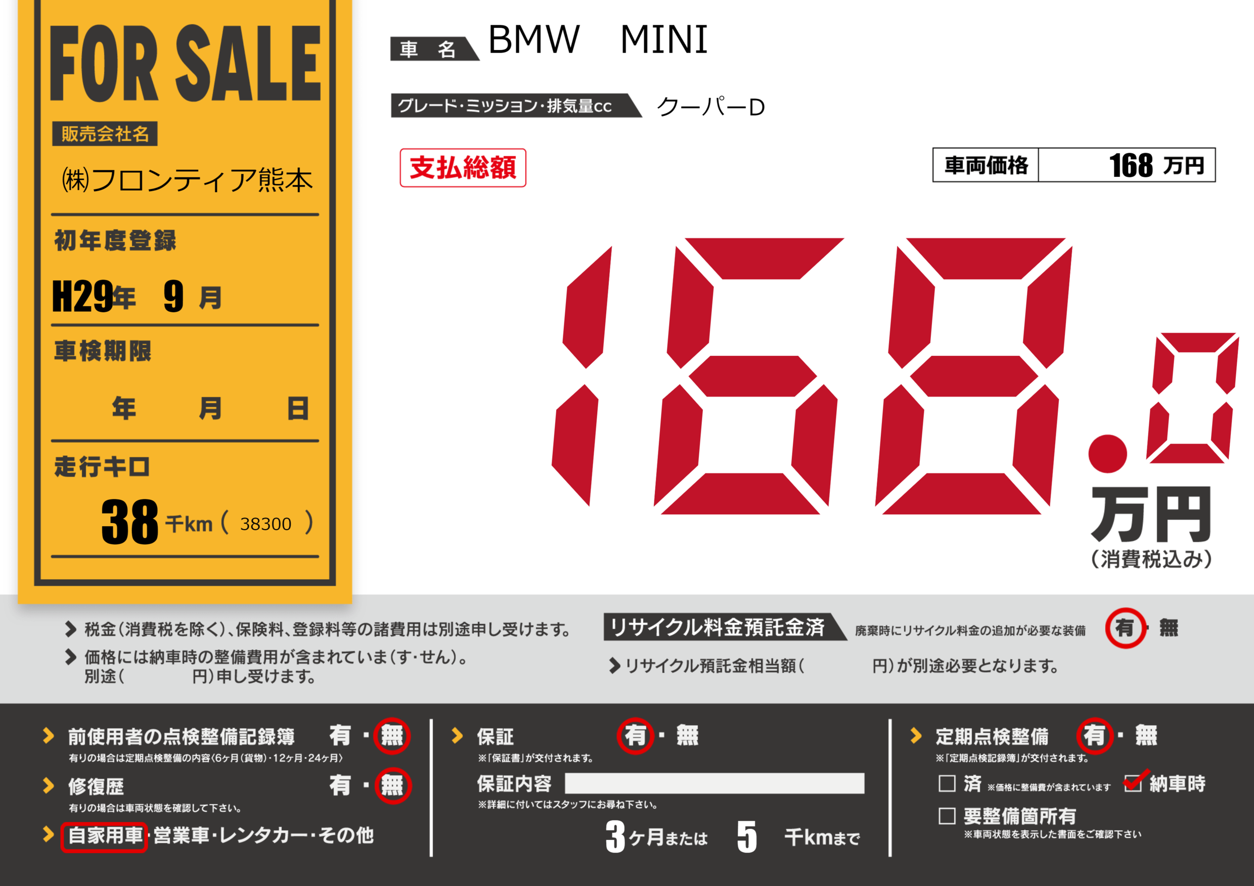 | 車名 | BMW MINI | グレード ミッション 排気量 |
