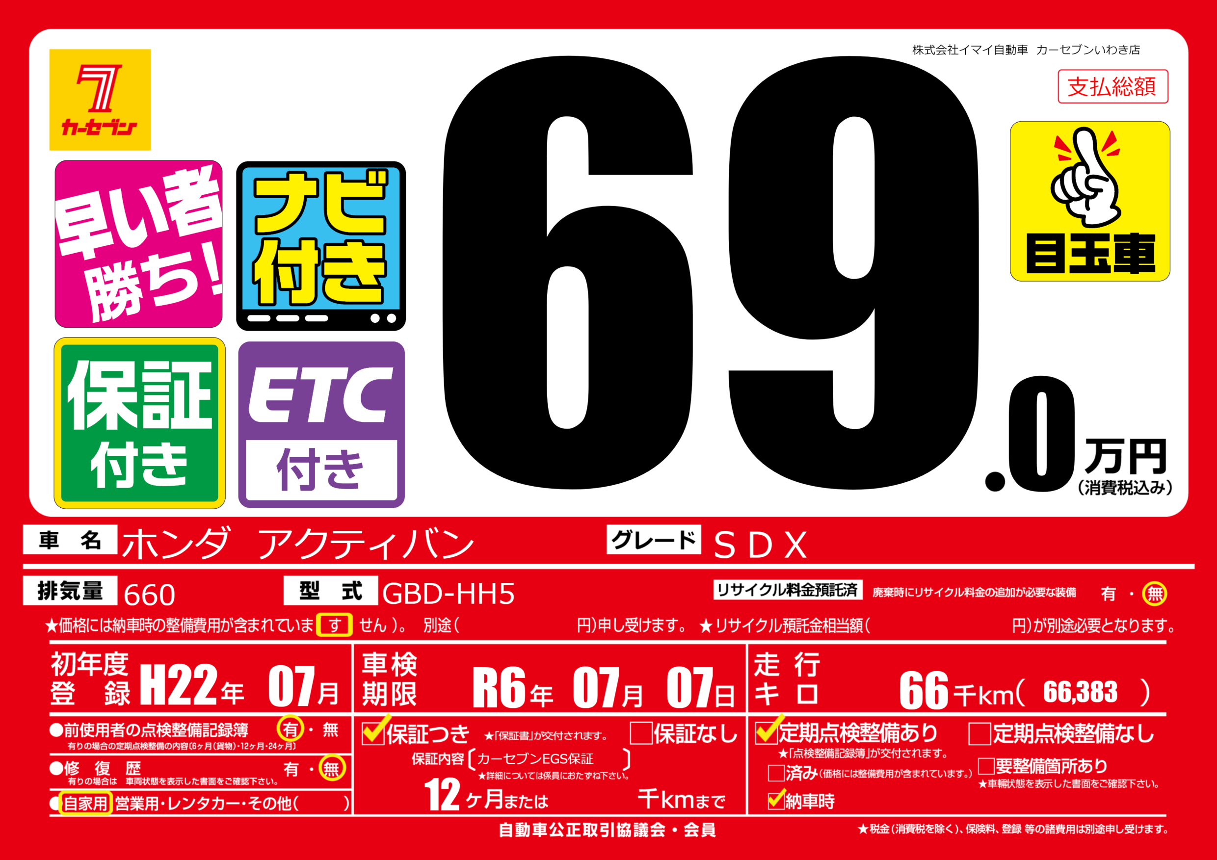 | 車名 | ホンダ アクティバン | グレード ミッション 排気量 |