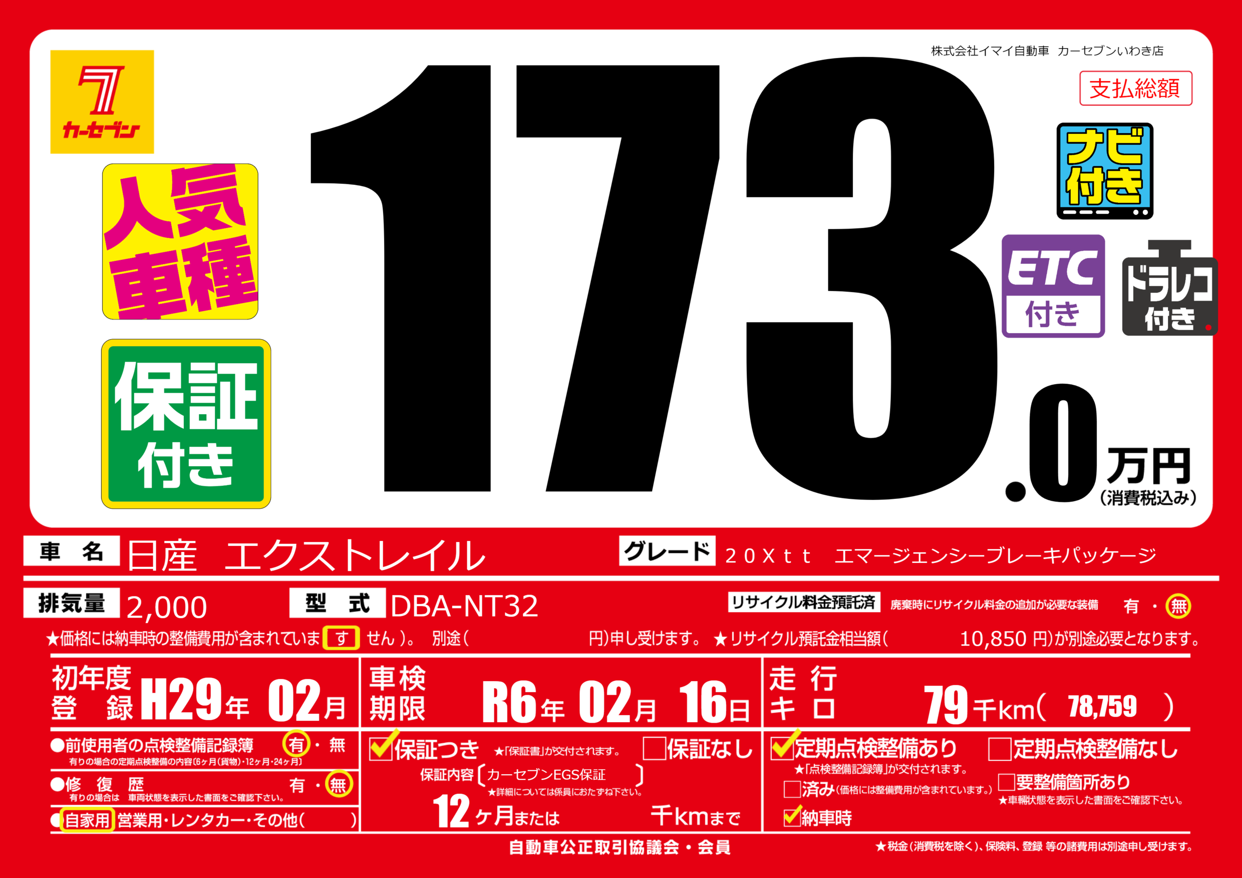 | 走行キロ | 7.9万km | 初年度登録 | H29年02月 |