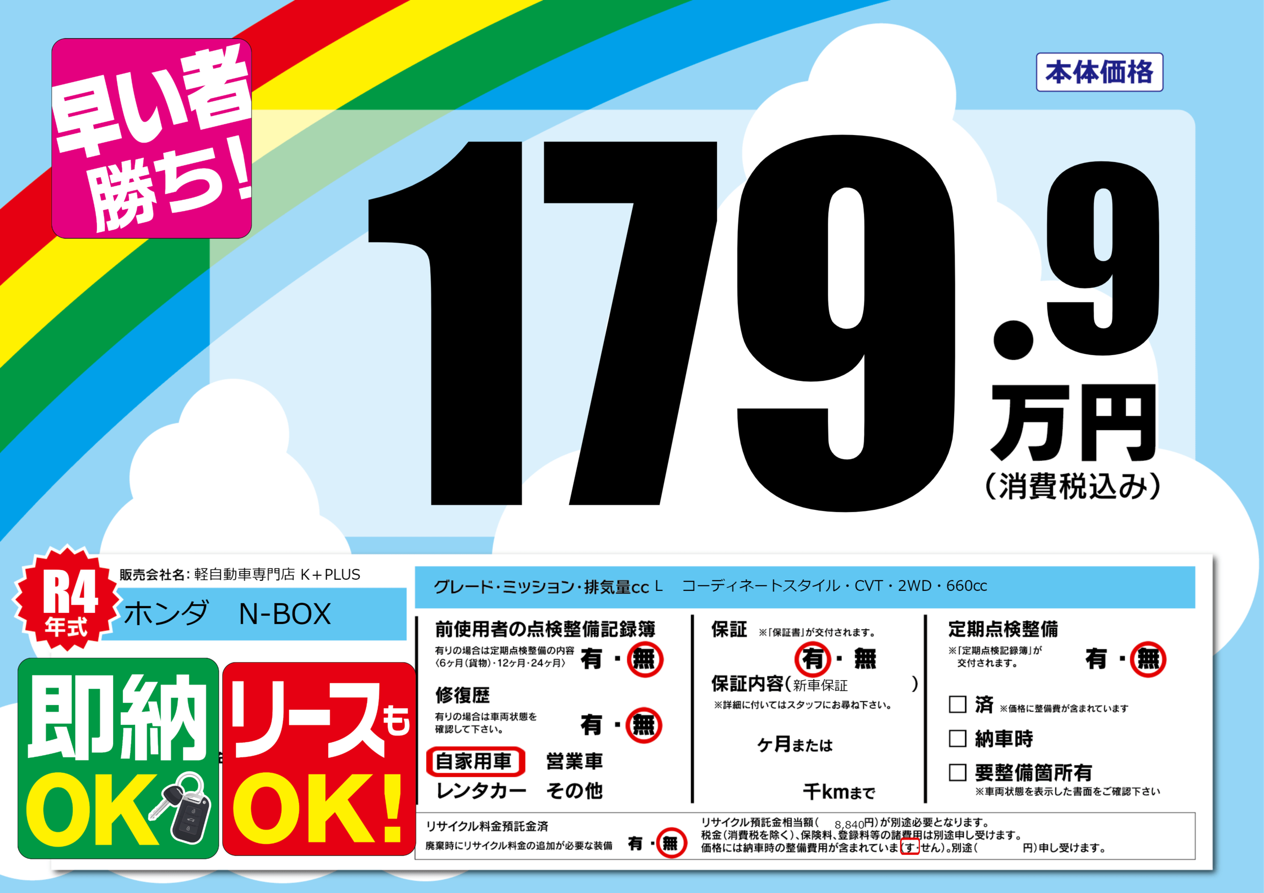 | 車名 | ホンダ N-BOX | グレード ミッション 排気量 |