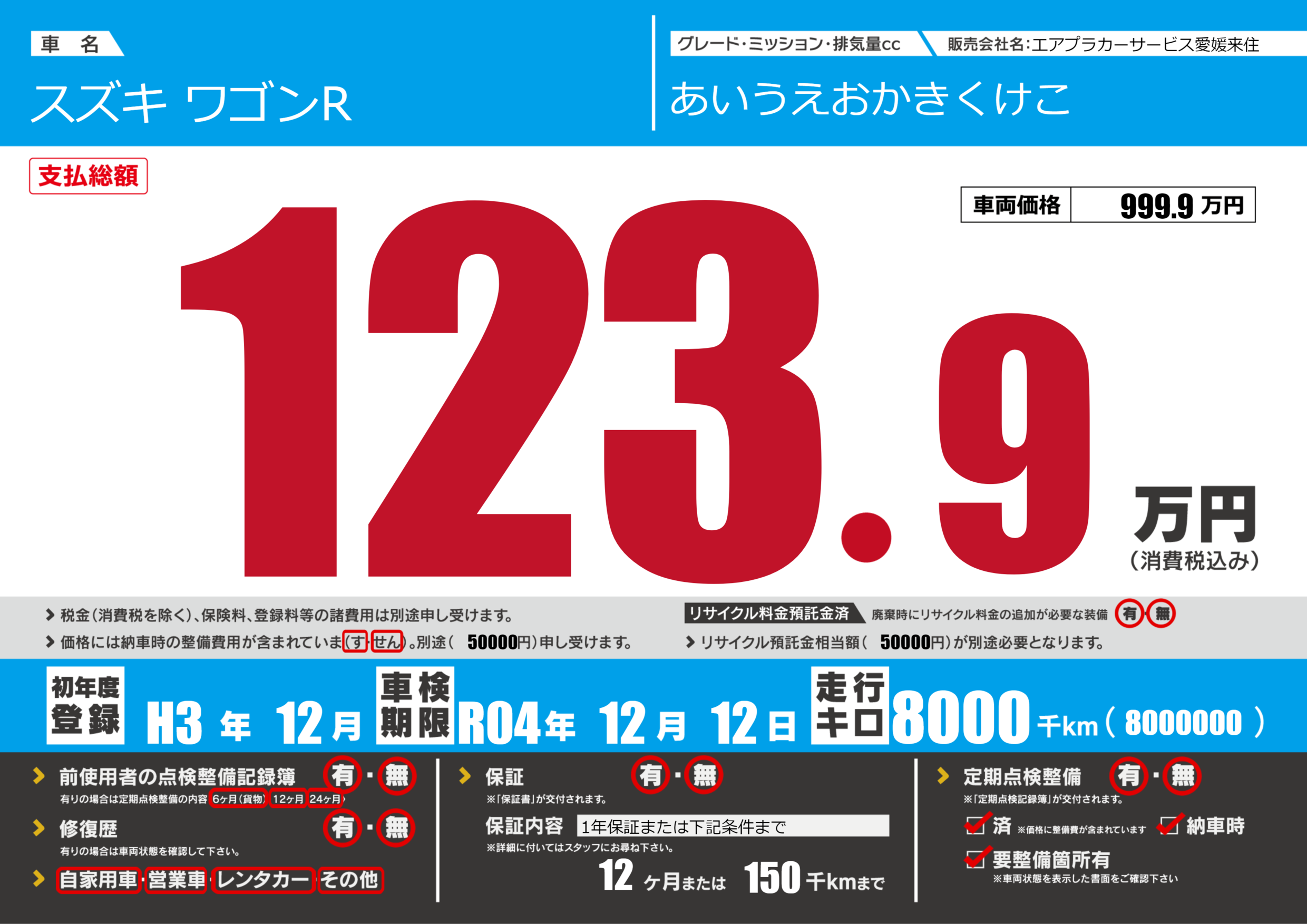 | 定期点検整備 | 定期点検整備あり 定期点検整備なし 定期点検整備済み 要整備箇所あり 納車時あり | ||