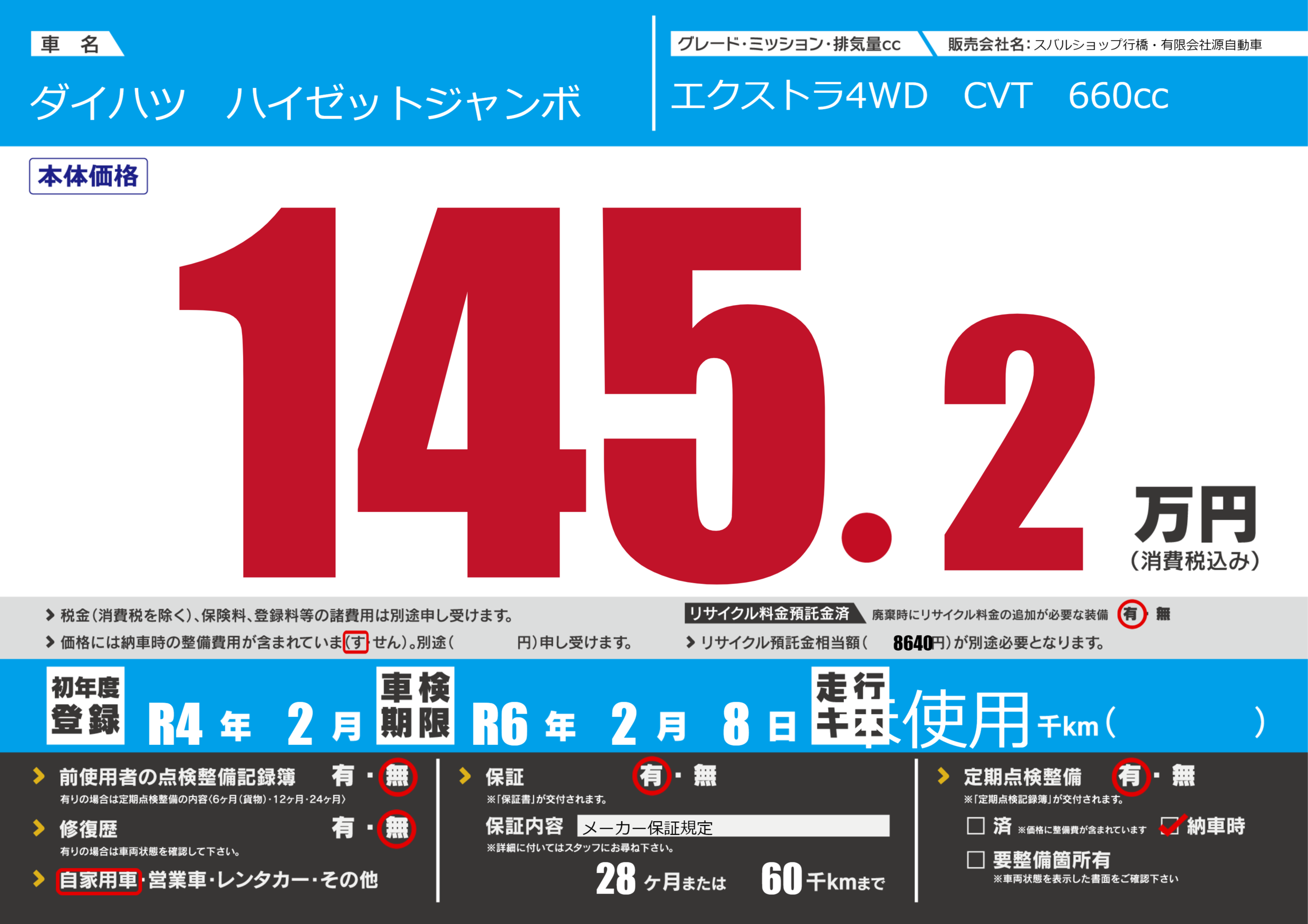 | 車名 | ダイハツ ハイゼットジャンボ | グレード ミッション 排気量 |