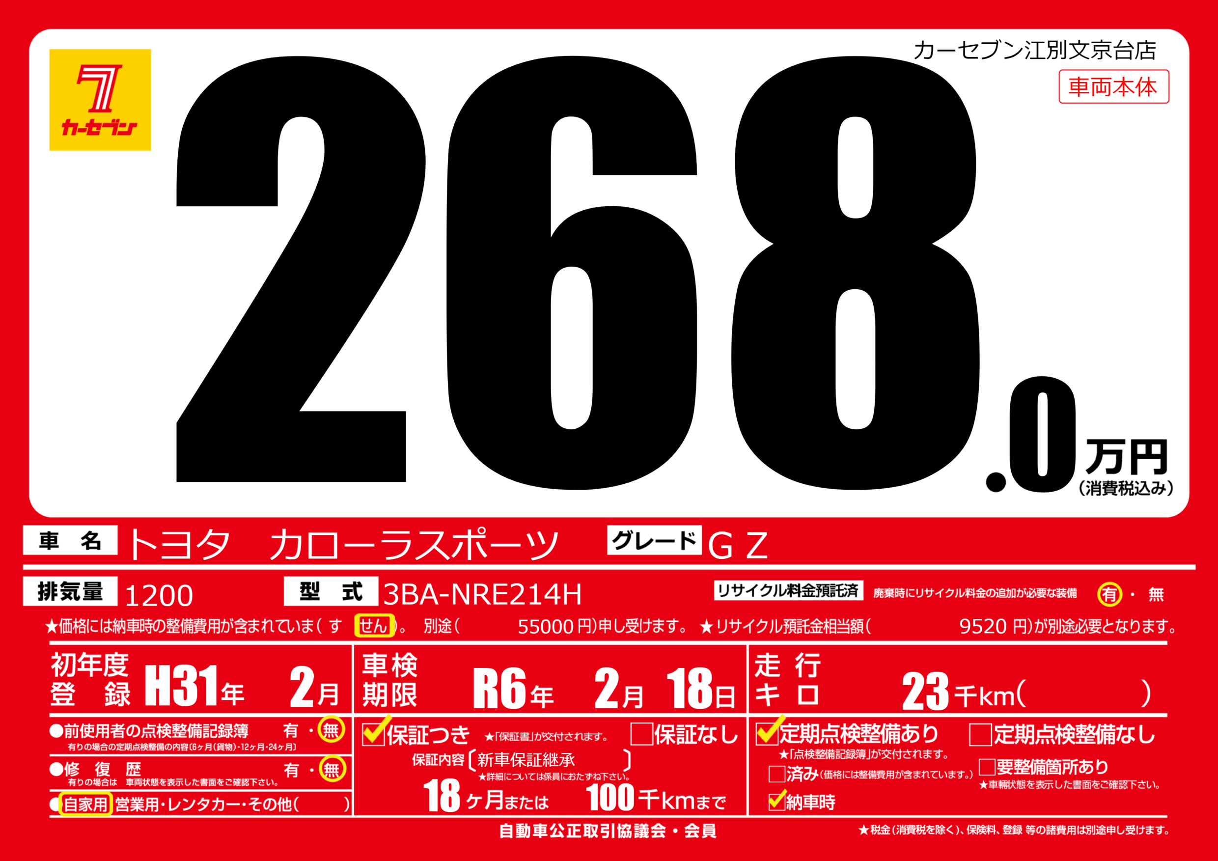 | 車名 | トヨタ カローラスポーツ | グレード ミッション 排気量 |