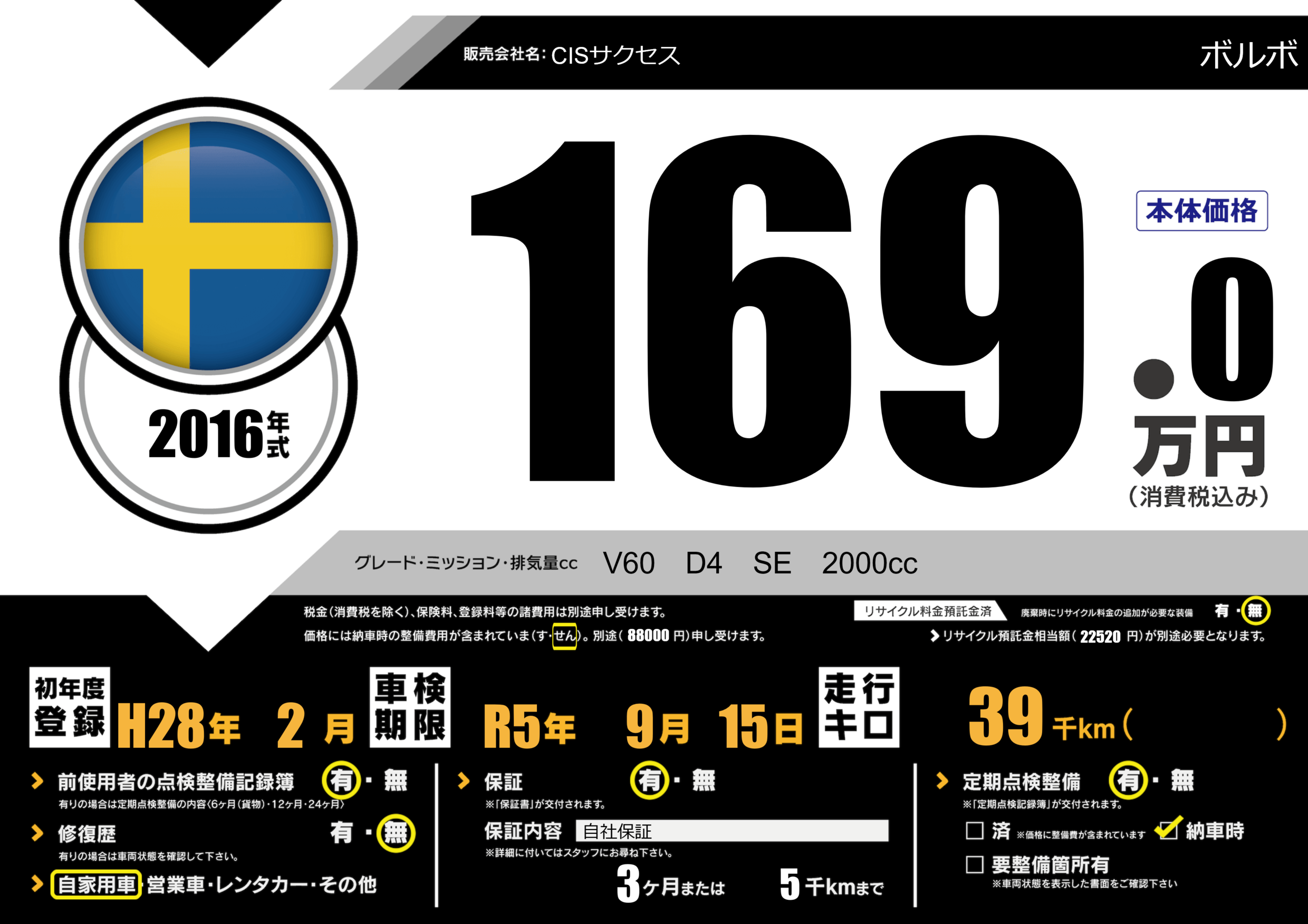 保証付き 保証内容(自社保証) 3ヶ月または(5)千kmまで |