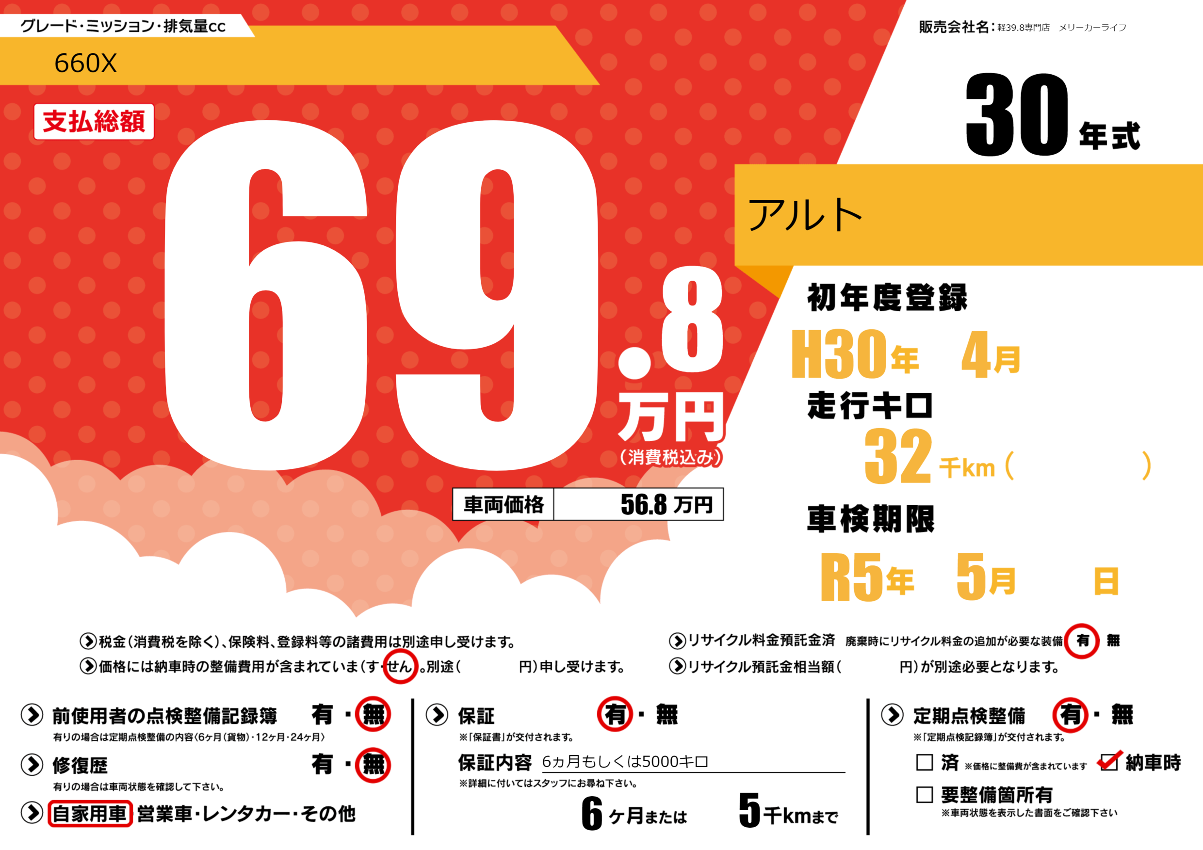 | 定期点検整備 | 定期点検整備あり 納車時あり | ||