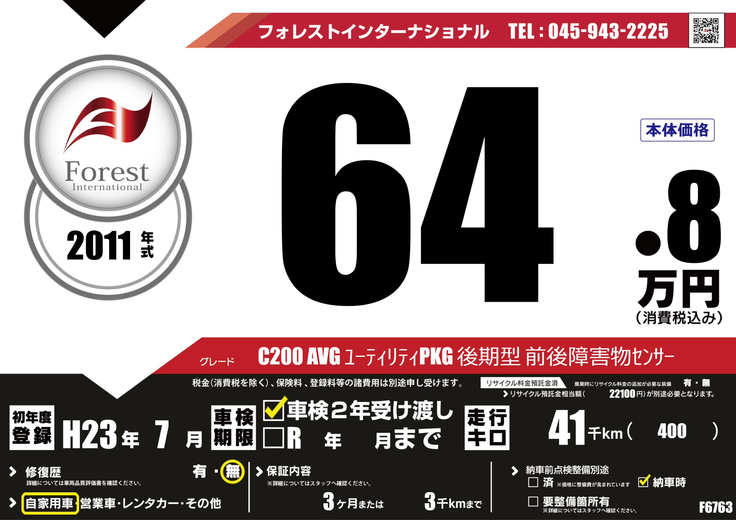 | 走行キロ | 4.1万km | 初年度登録 | H23年7月 |