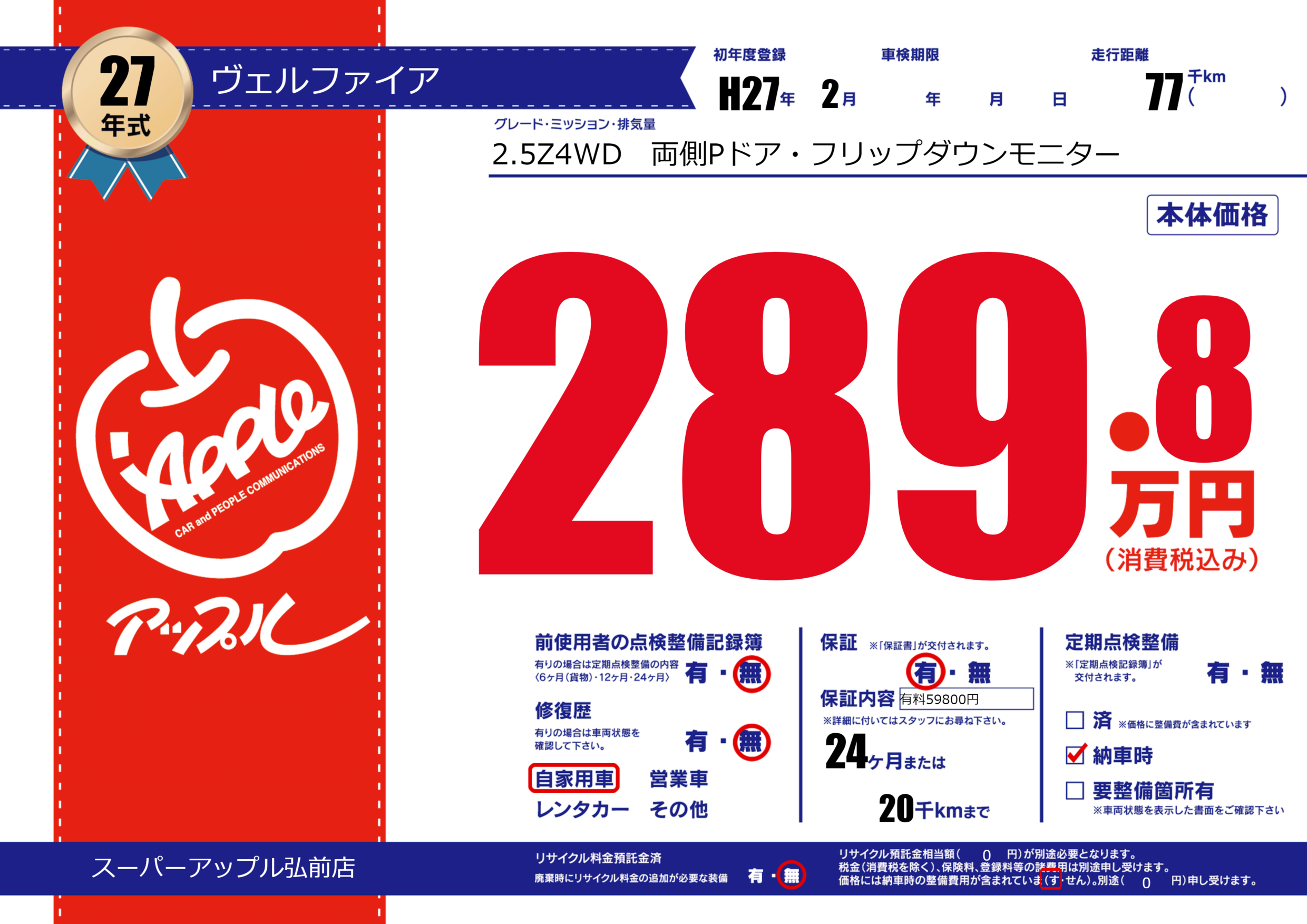 | 走行キロ | 7.7万km | 初年度登録 | H27年2月 |
