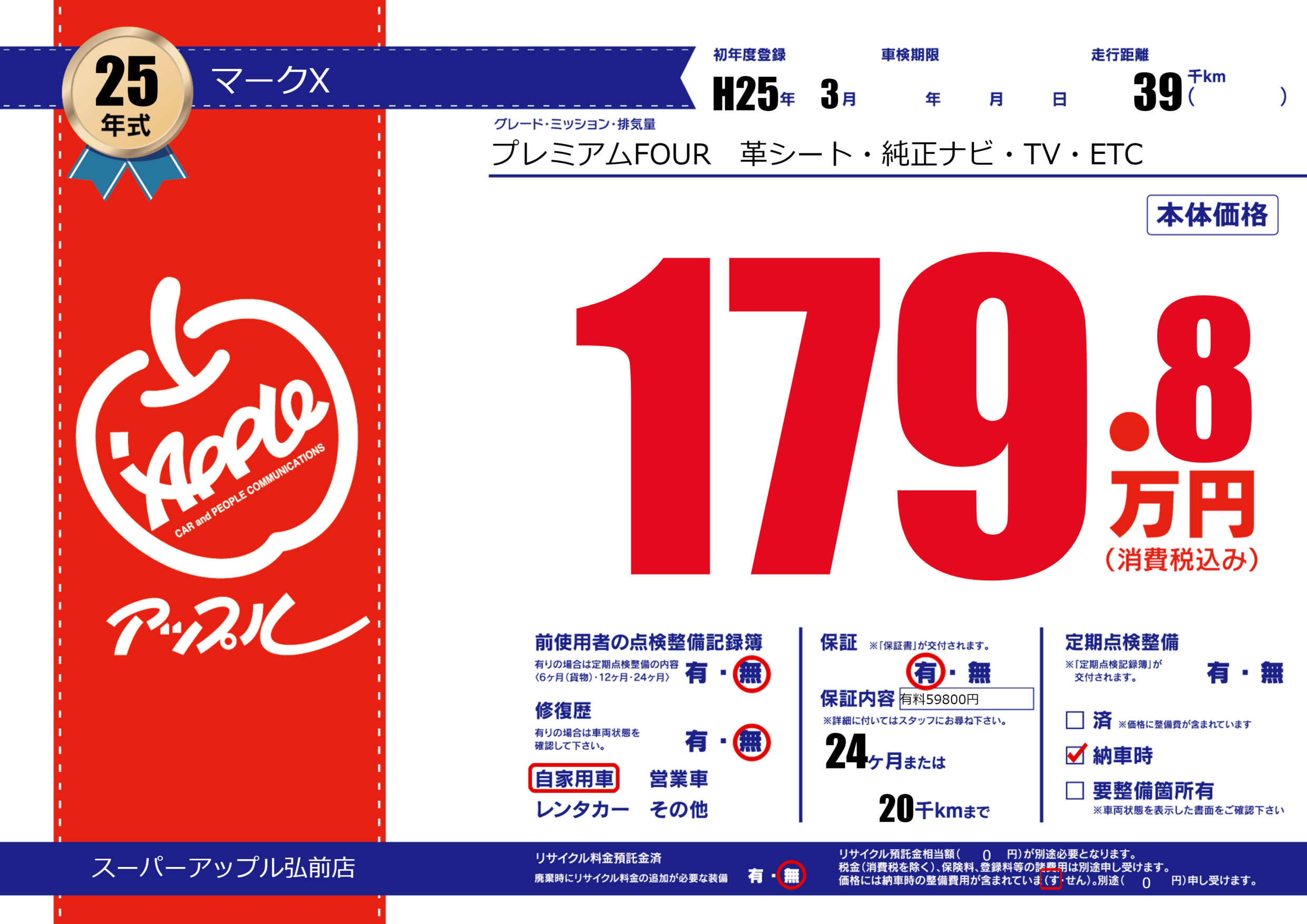 保証付き 保証内容(有料59800円) 24ヶ月または20千km |