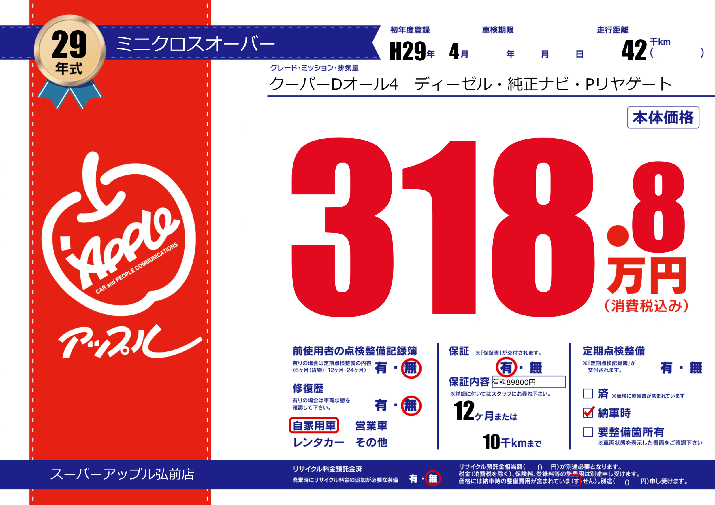 保証付き 保証内容(有料89800円) 12ヶ月または10千km |