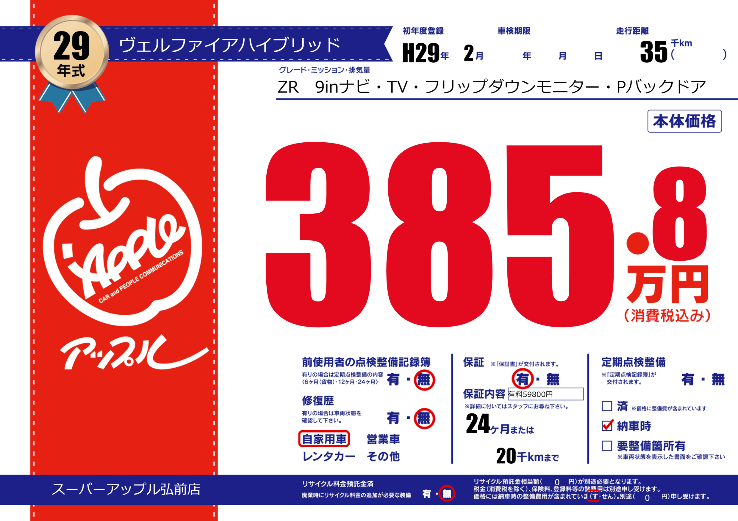 保証付き 保証内容(有料59800円) 24ヶ月または20千km |