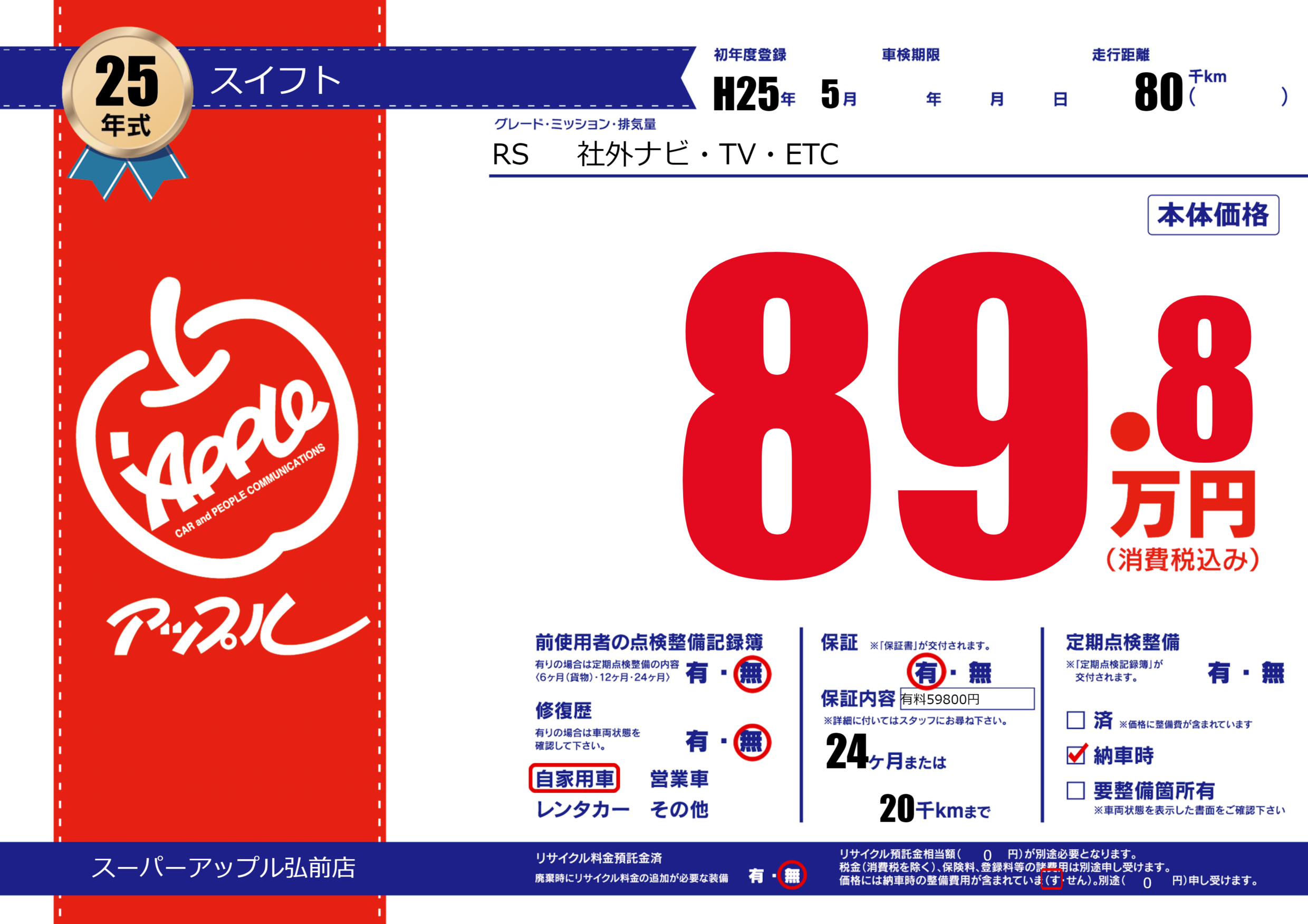 | 走行キロ | 8万km | 初年度登録 | H25年5月 |