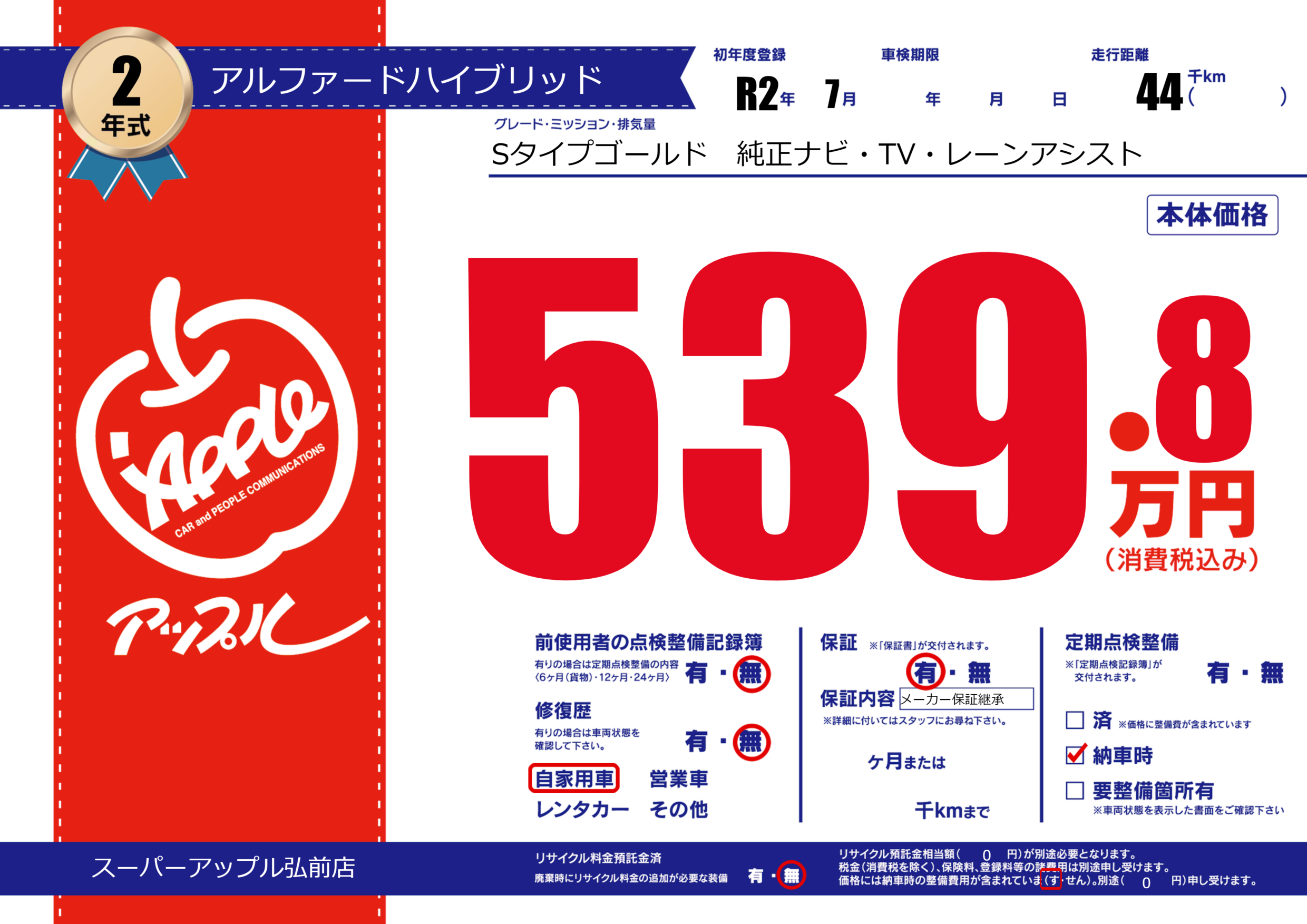 | 車名 | アルファードハイブリッド | グレード ミッション 排気量 |
