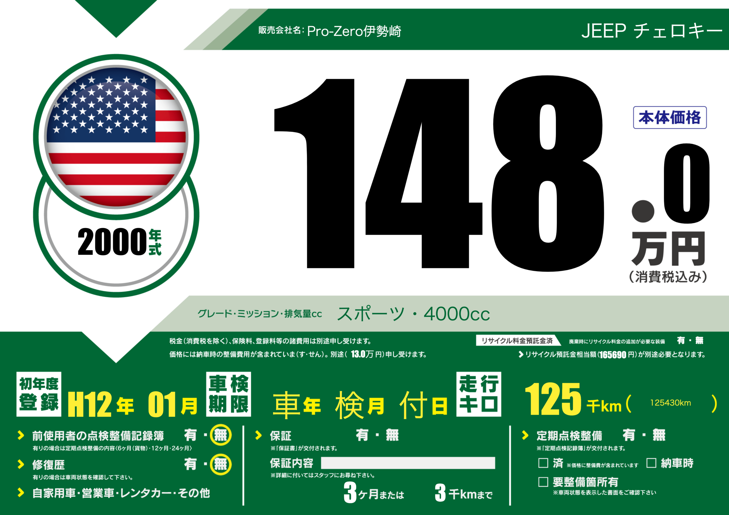 | 車名 | JEEP チェロキー | グレード ミッション 排気量 |