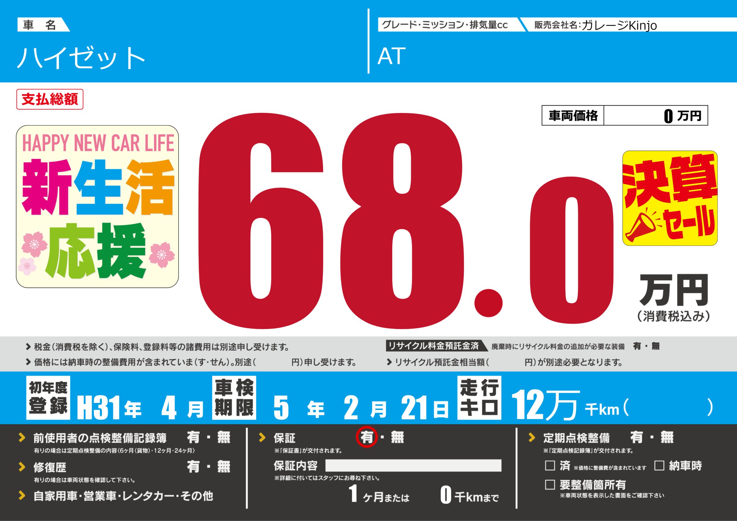 保証付き 保証内容(---) 1ヶ月または(0)千kmまで |
