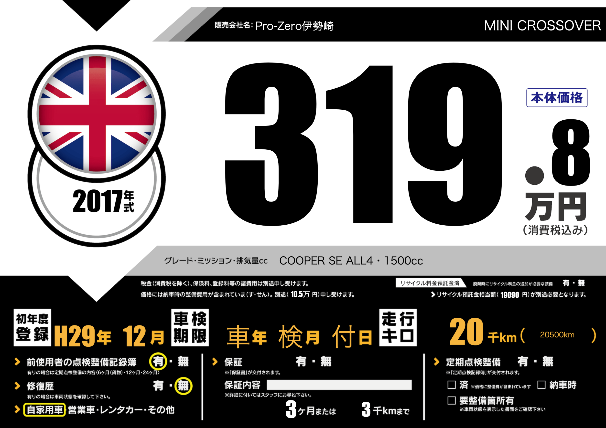 | 車名 | MINI CROSSOVER | グレード ミッション 排気量 |