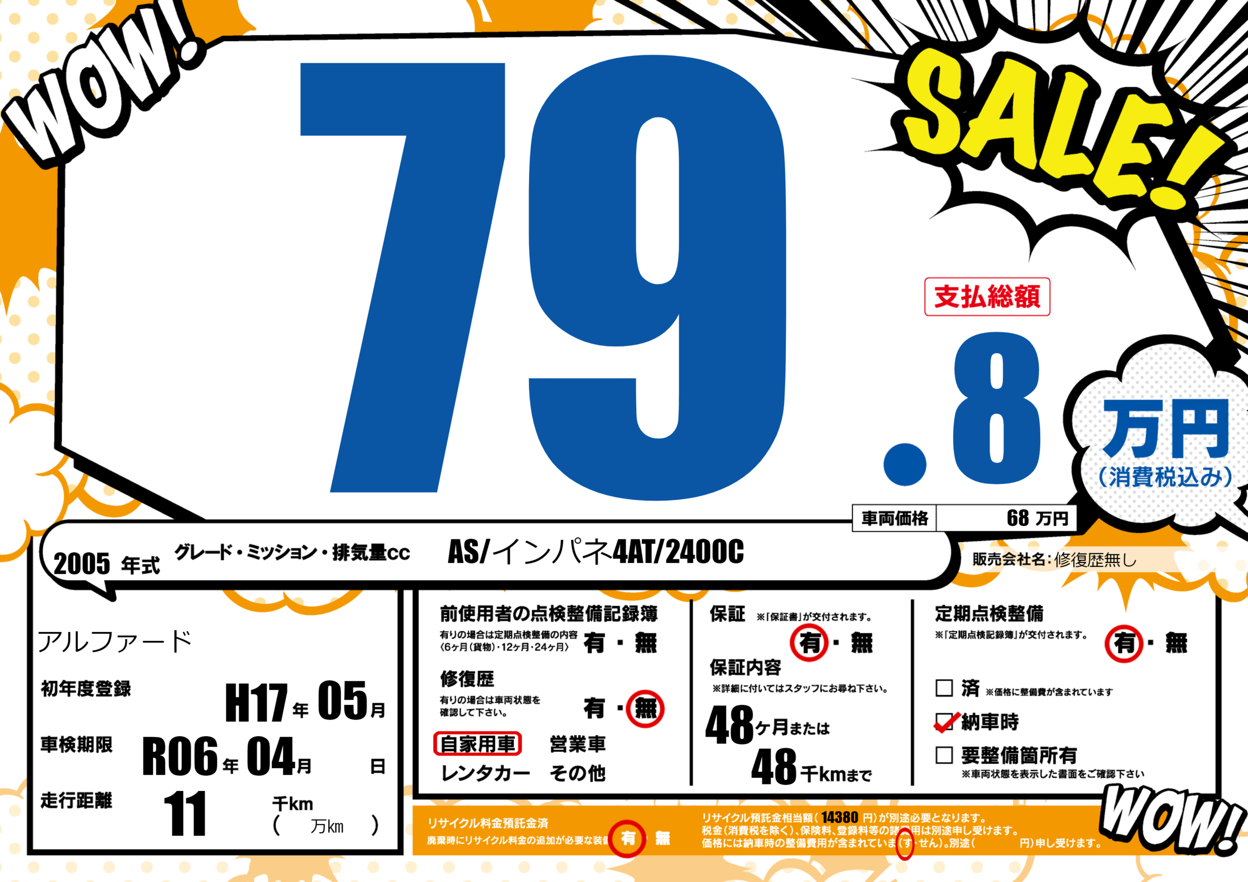 | 走行キロ | 1.1万km | 初年度登録 | H17年05月 |