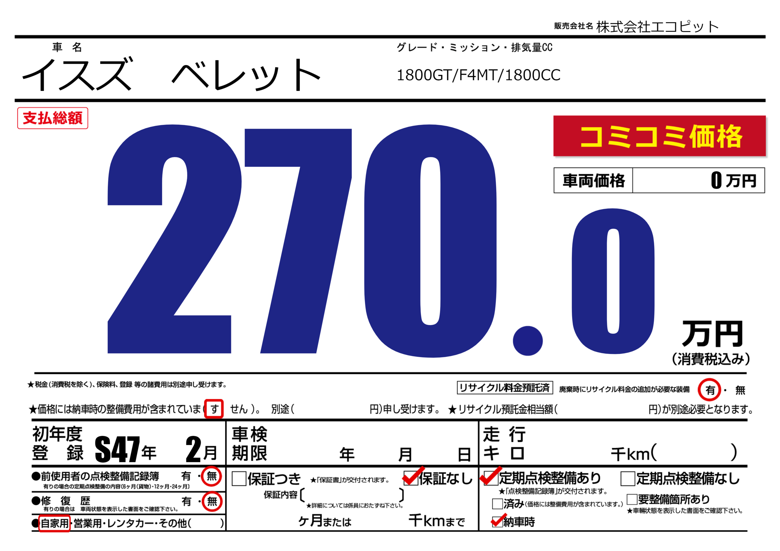 | 車名 | イスズ ベレット | グレード ミッション 排気量 |