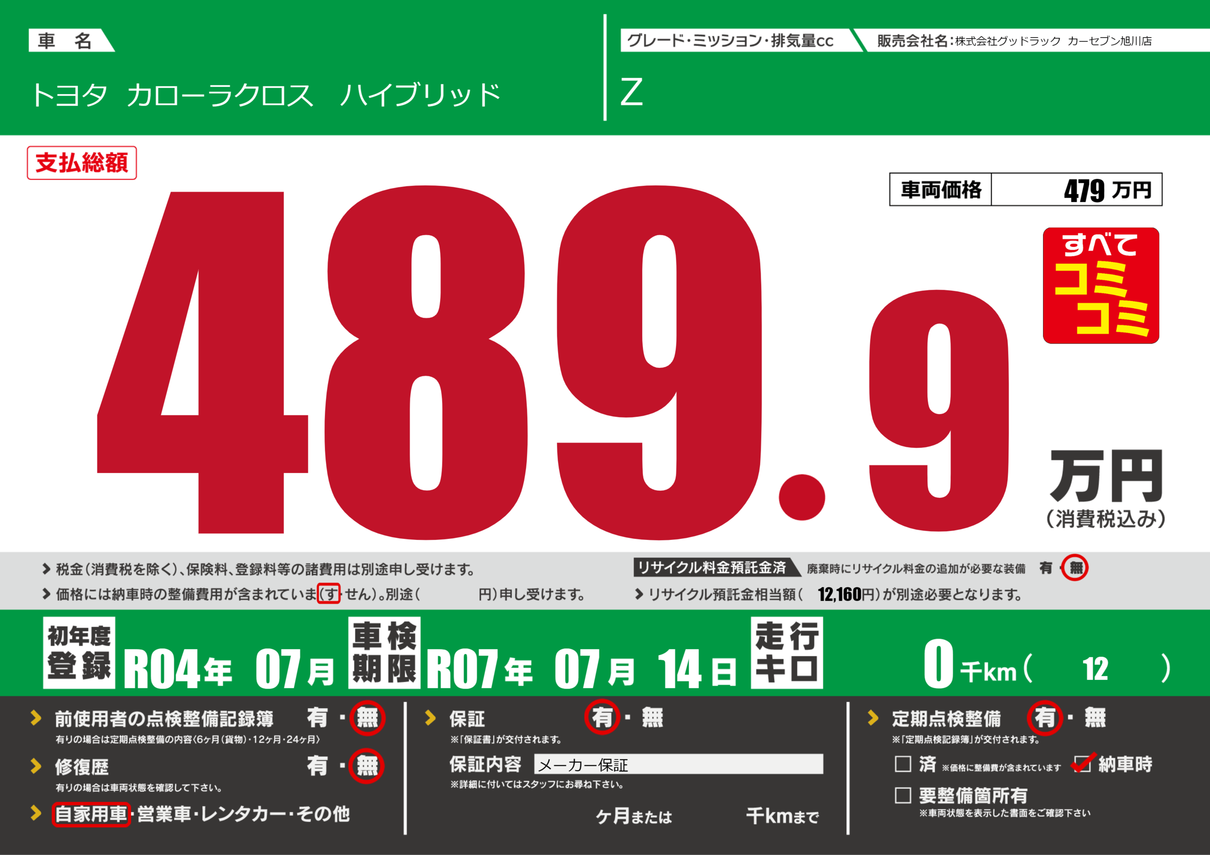 | 定期点検整備 | 定期点検整備あり 納車時あり | ||