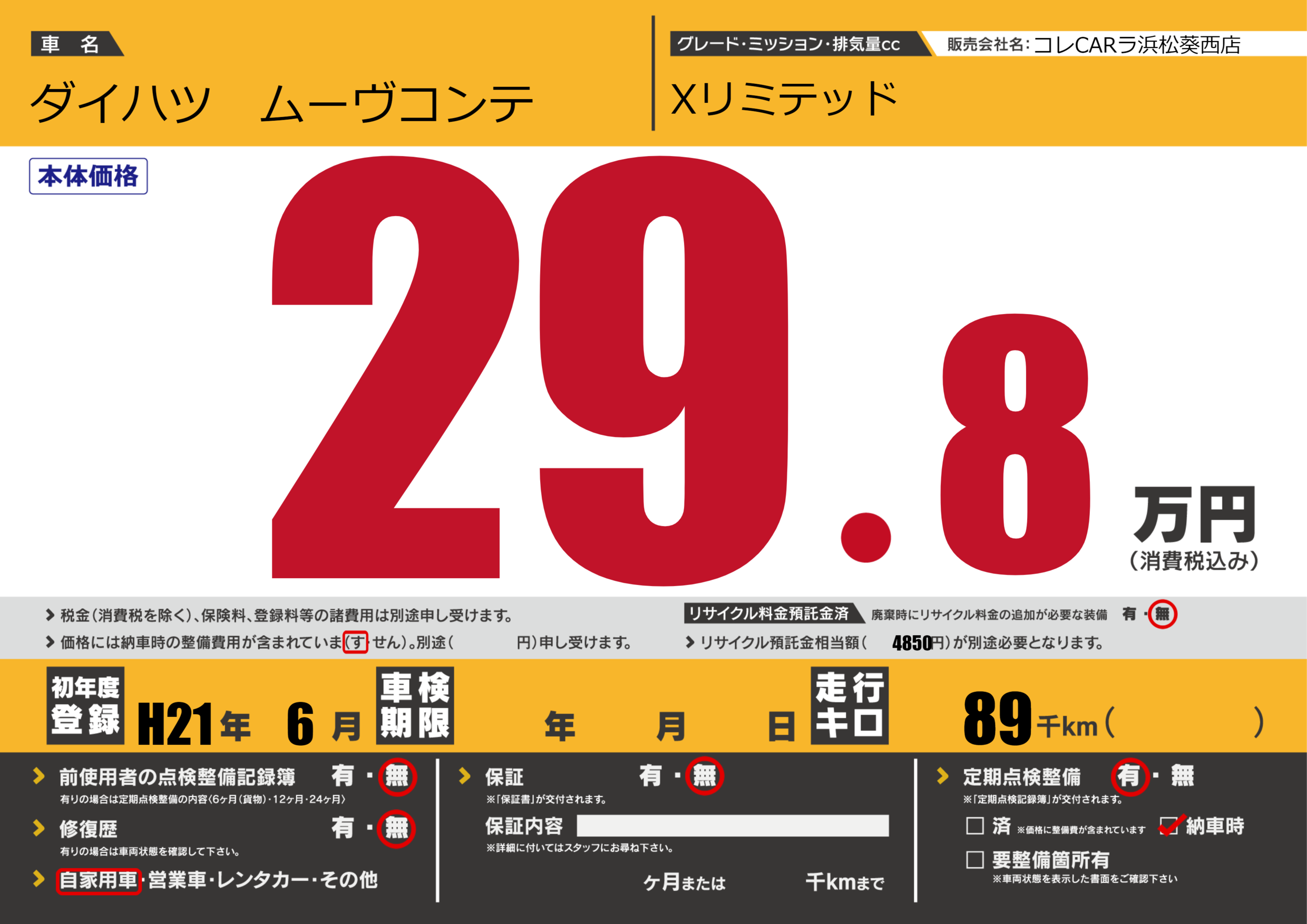 | 走行キロ | 8.9万km | 初年度登録 | H21年6月 |