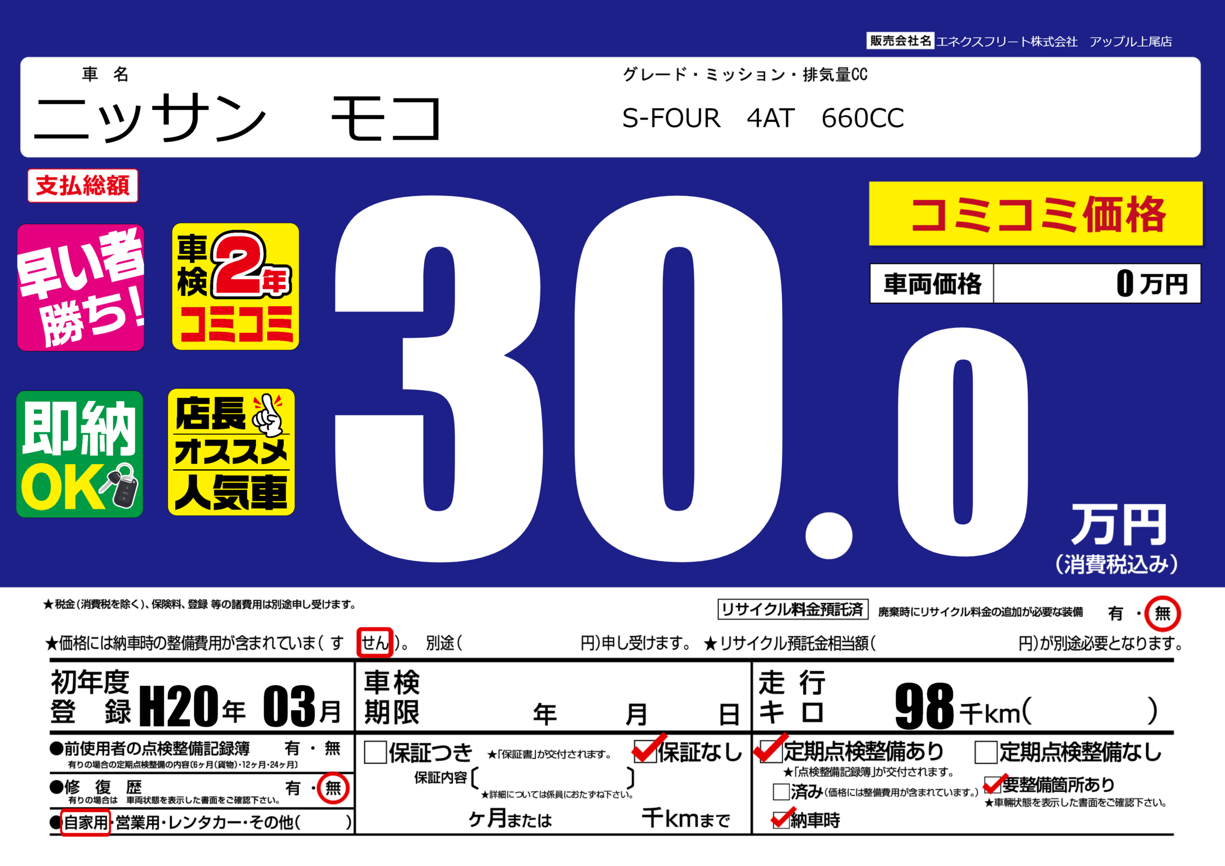 | 車名 | ニッサン モコ | グレード ミッション 排気量 |