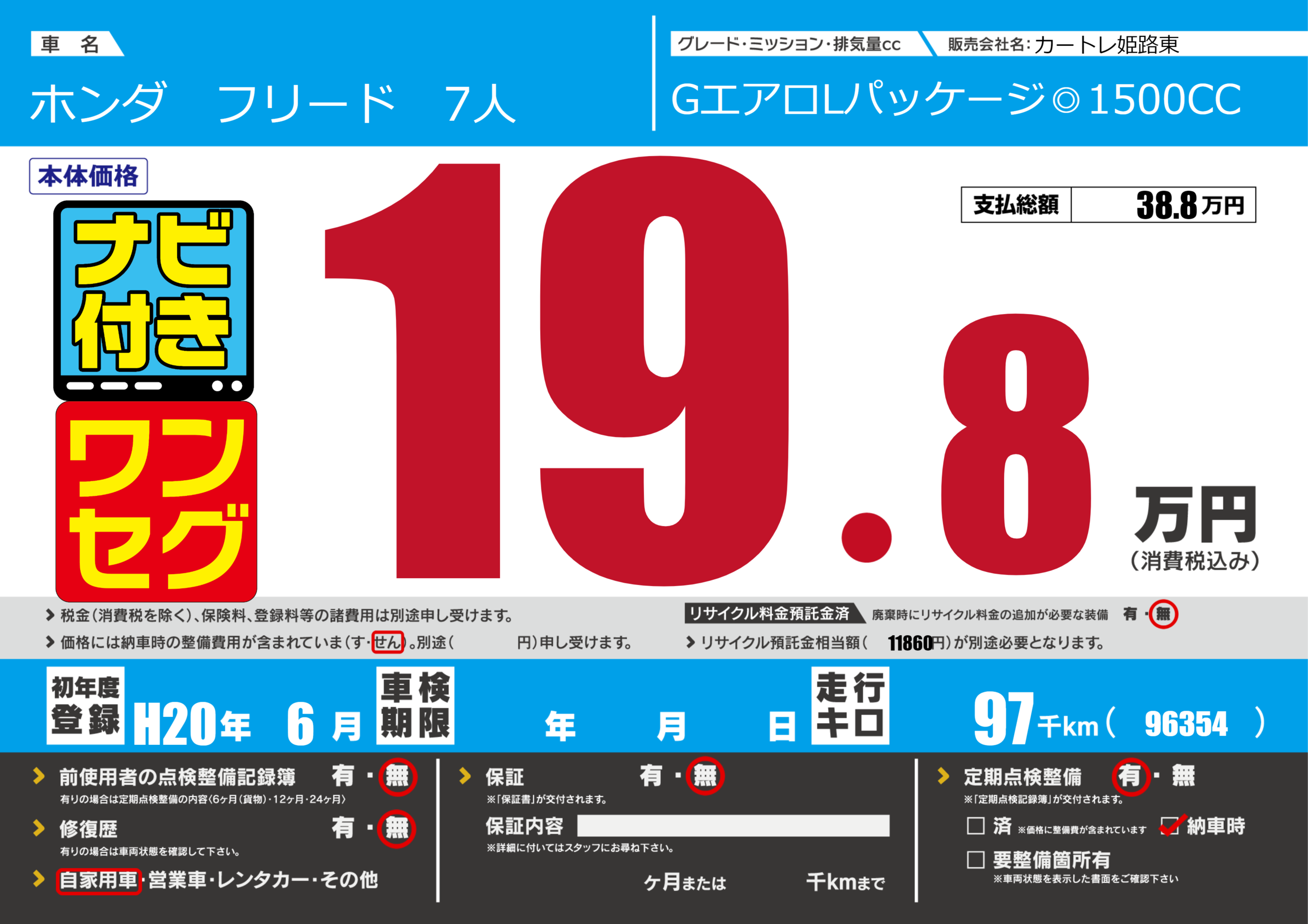 | 車名 | ホンダ フリード 7人 | グレード ミッション 排気量 |