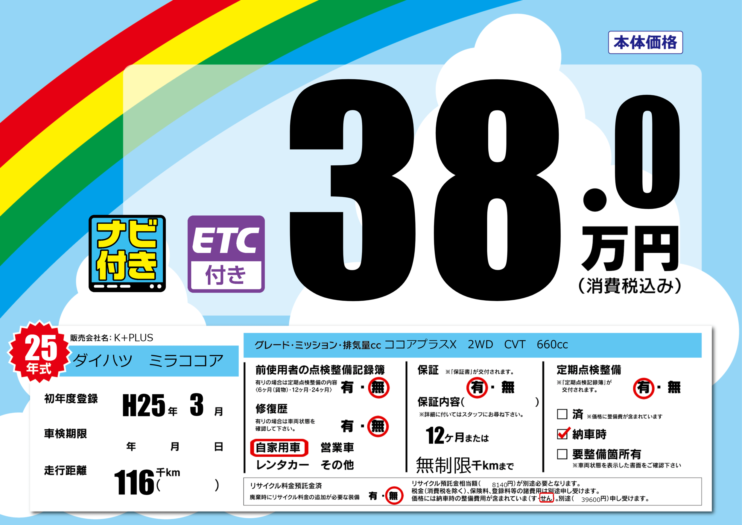 | 車名 | ダイハツ ミラココア | グレード ミッション 排気量 |