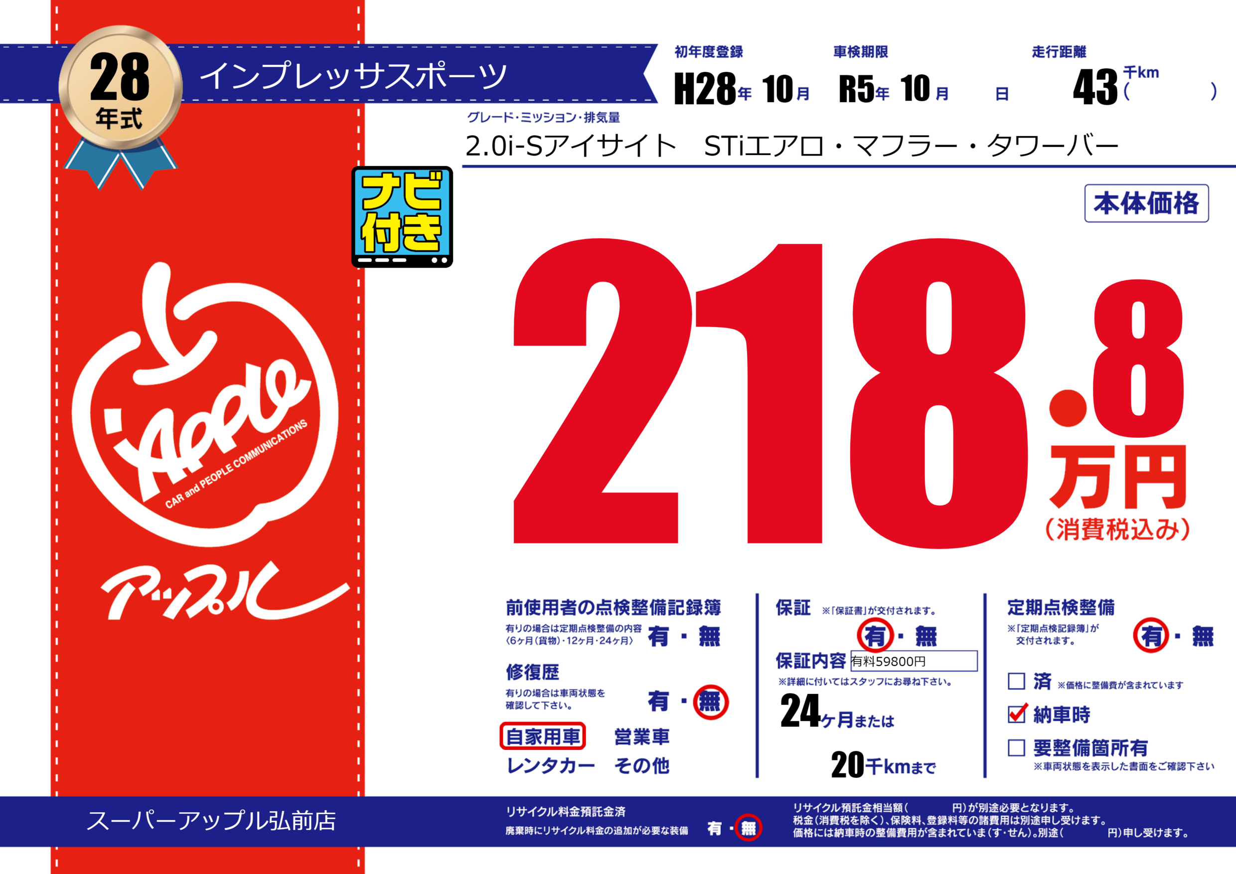 | 車名 | インプレッサスポーツ | グレード ミッション 排気量 |