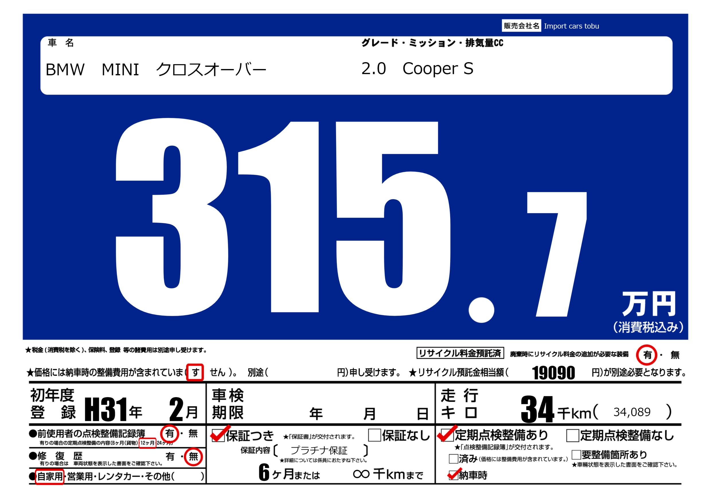 | 車名 | BMW MINI クロスオーバー | グレード ミッション 排気量 |